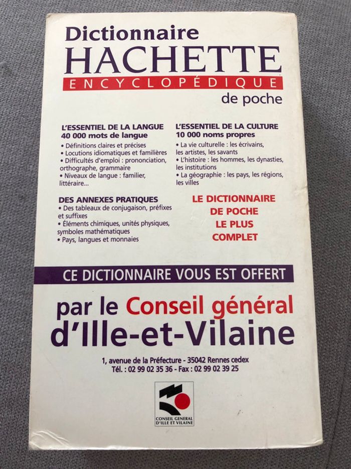 #videdressing85livrescolaires bonjour TBE dictionnaire encyclopédique de poche Hachette -noms communs -noms propres -50 000 mots -tableaux de conjugaison -préfixes et suffixes -éléments chimiques -unités physiques -symboles mathématiques -pays -langues -monnaies cdlt