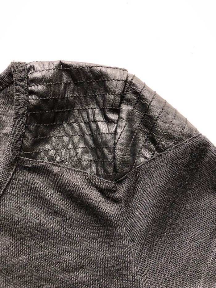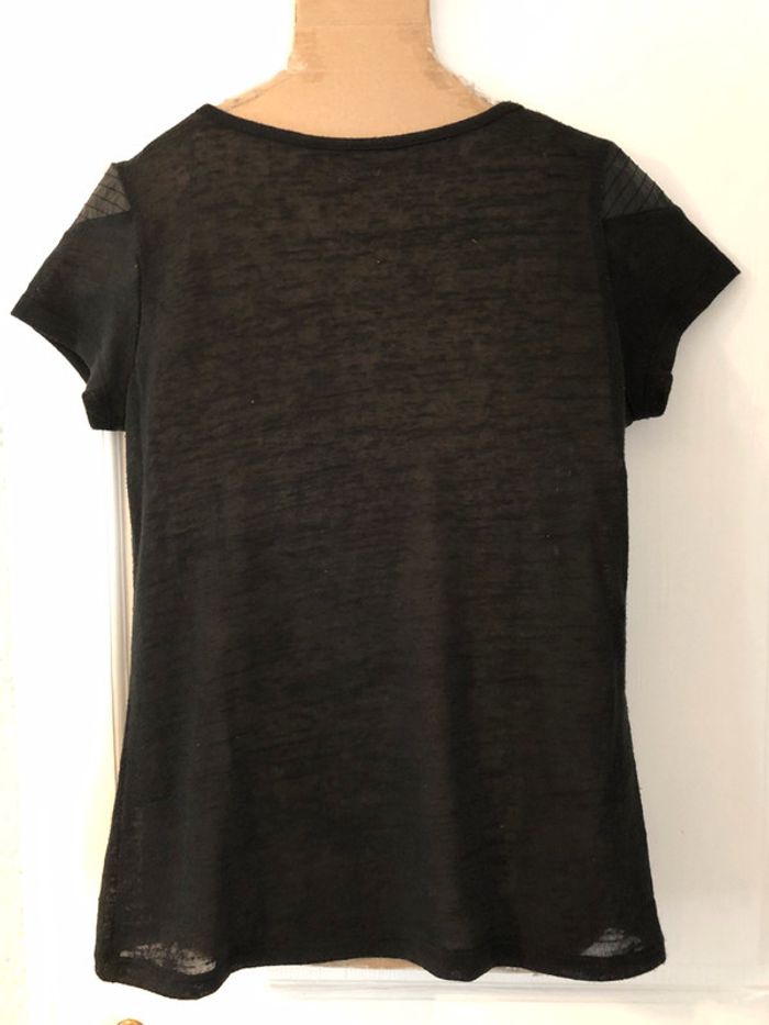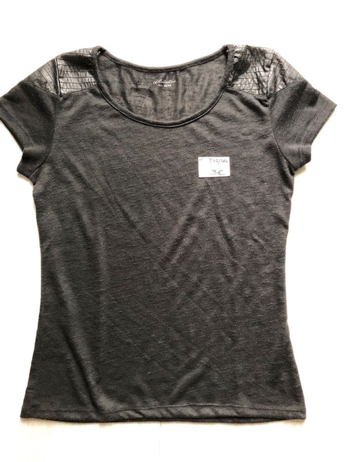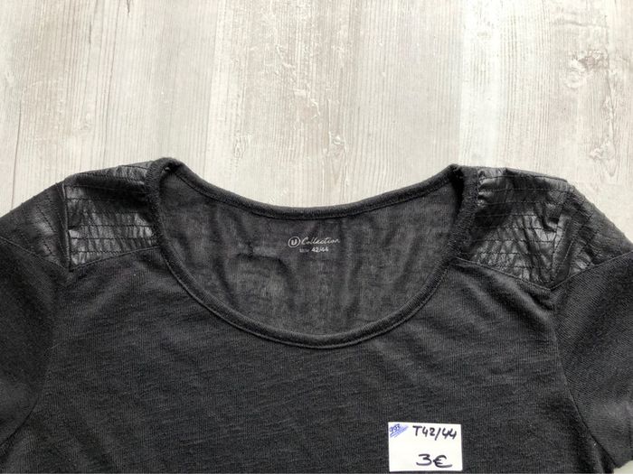 #videdressing85vêtfemmeXLXXL4244 bonjour tee-shirt noir T 42/44 XL/XXL porté 2/3 fois grande encolure ronde fantaisie aux épaules imitation cuir avec sur-piqures cdlt