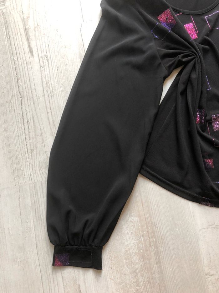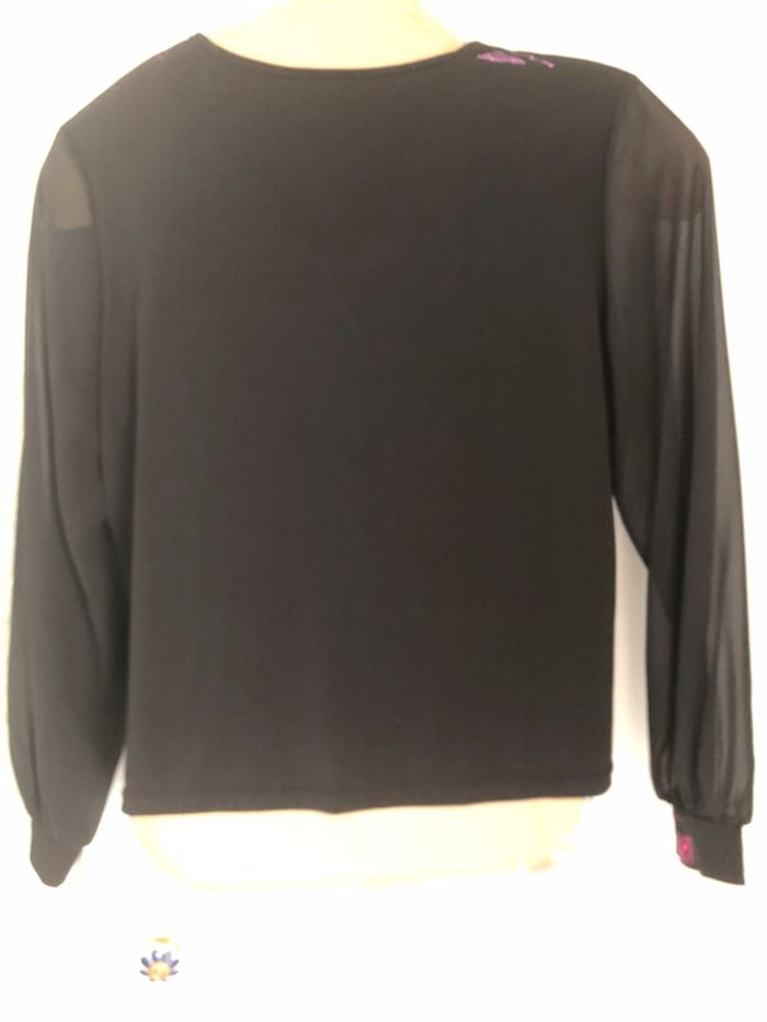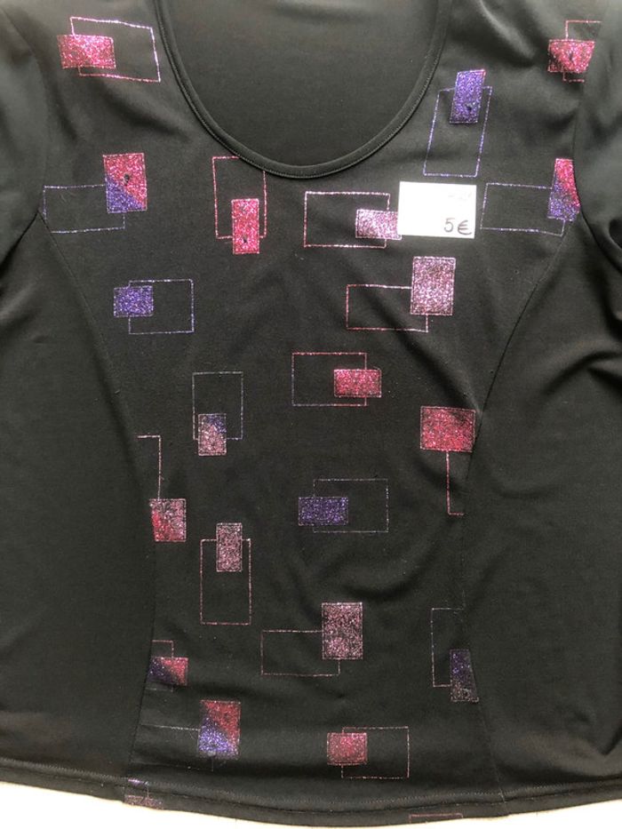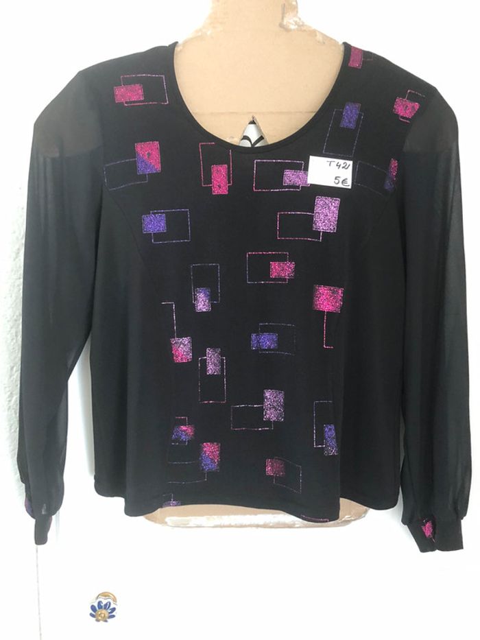 #videdressing85vêtfemmeXL42 #videdressing85vintage bonjour très peu porté, excellent état blouse noire manches en voile opaque T 42. XL devant avec motifs géométriques bodés en fils pailletés manches longues en voile opaque cdlt