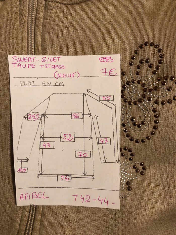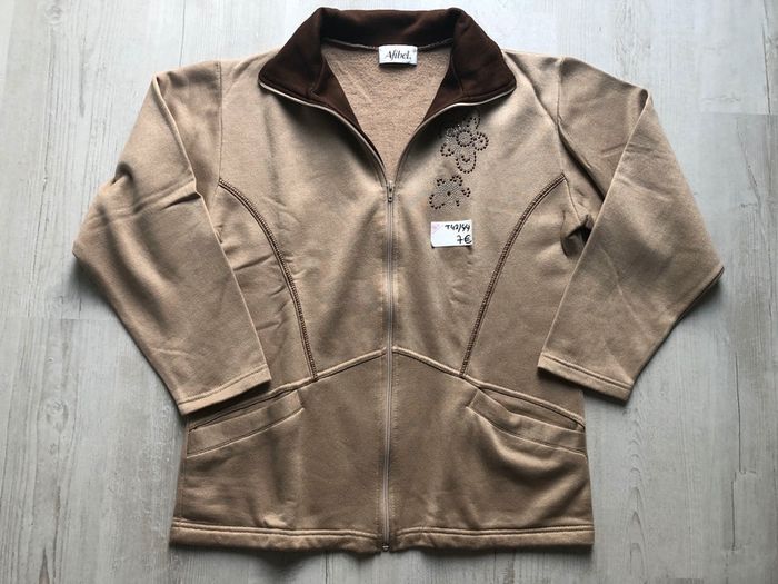 Bonjour #videdressing85rienqueduneuf #videdressing85vêtfemmeXL42 #videdressing85vêtfemmeXLXXL4244 #videdressing85vêtfemmeXXL44 #videdressing85vintage NEUF T 42-44, XL-XXL Dimensions sur la dernière photo sweat- gilet couleur taupe vintage col marron chocolat zip et 2 poches devant broderies et strass poitrine cdlt