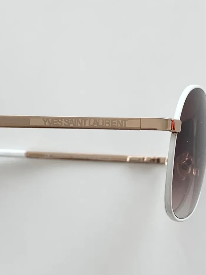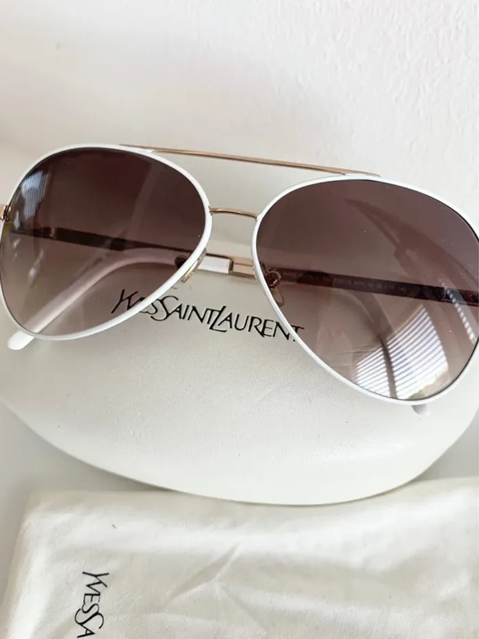 Apportez une touche de chic et d’élégance à vos looks d’été avec cette paire de lunettes de soleil Yves Saint Laurent authentiques ✨ • Contour blanc raffiné • Branches dorées et blanches élégantes • Style pilote, inspiré des iconiques Ray-Ban, mais avec la signature luxueuse YSL 💎 Un modèle intemporel qui allie mode et confort, parfait pour toutes les occasions 🌞. 📌 Très bon état – prêtes à sublimer vos tenues !