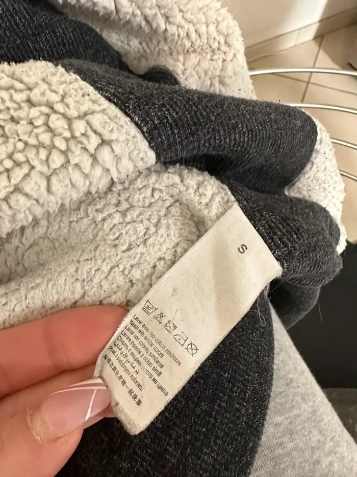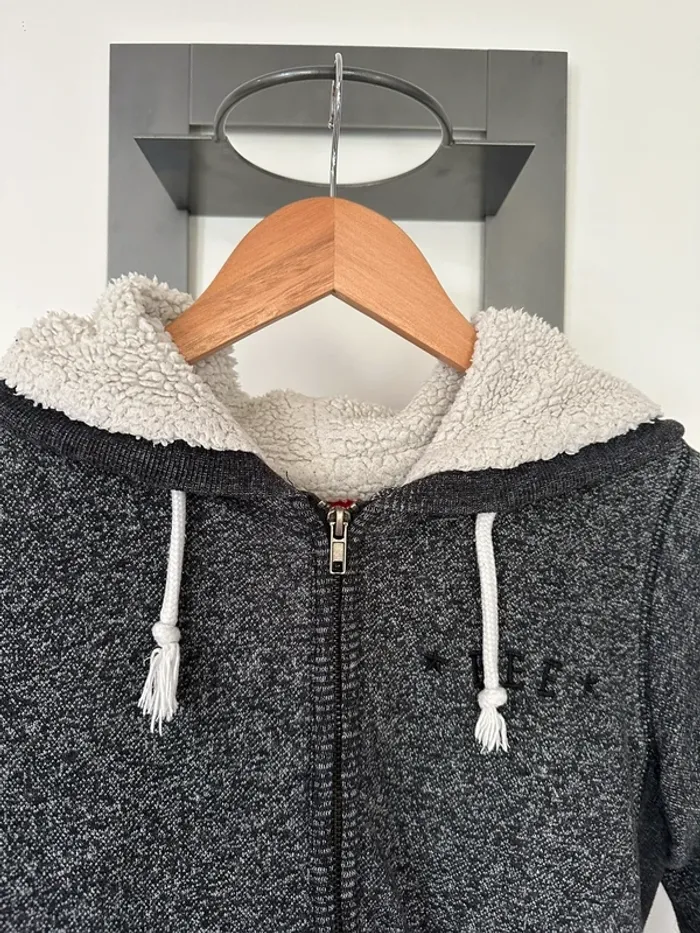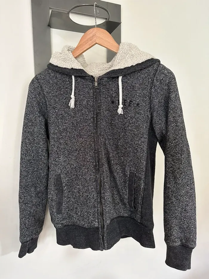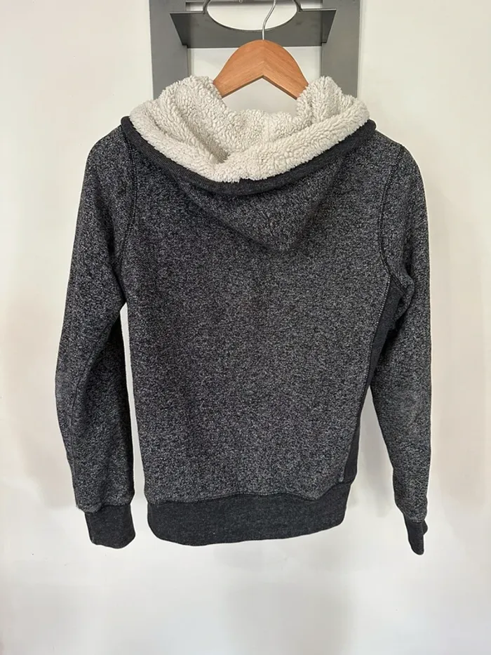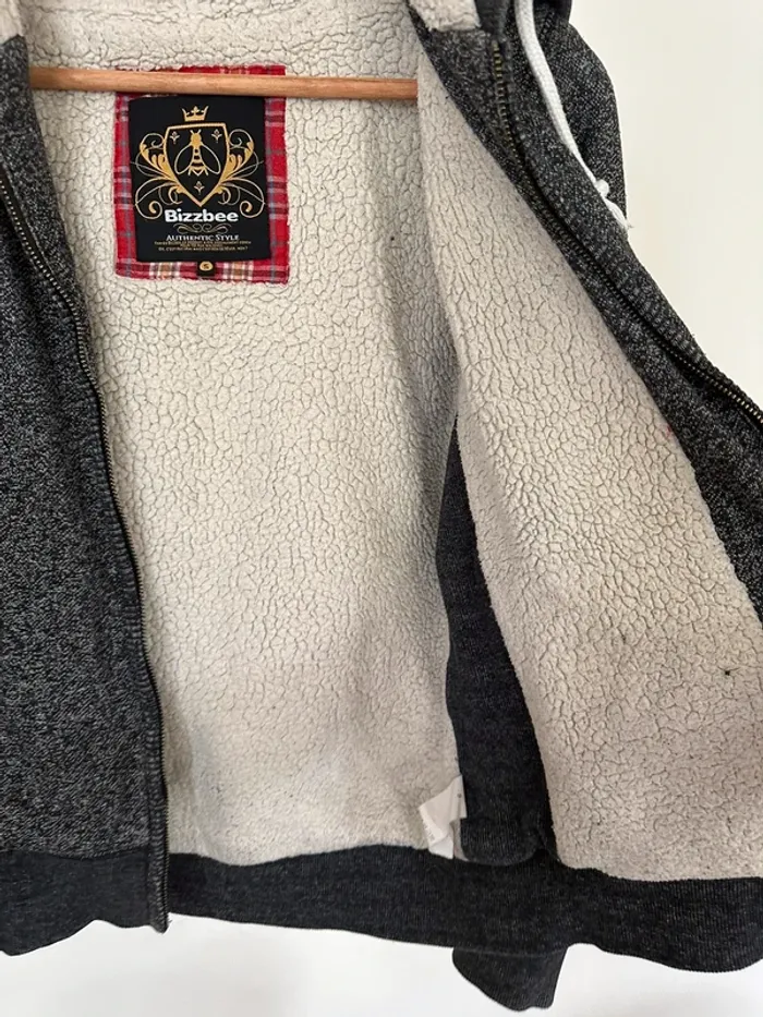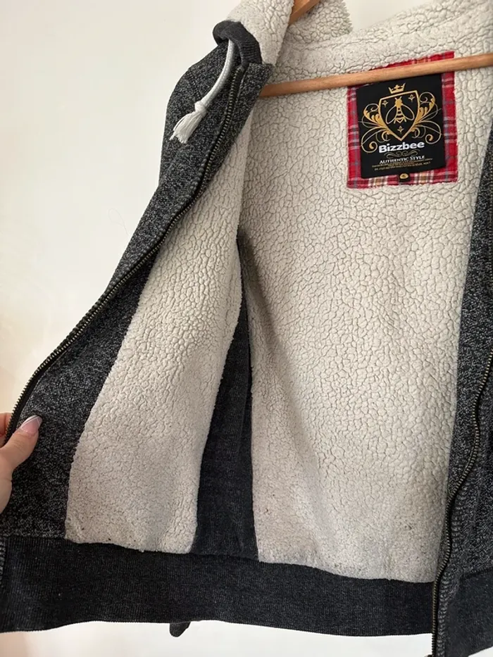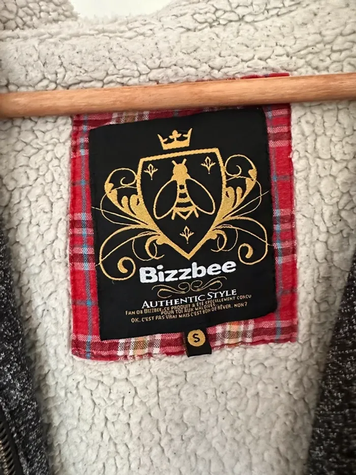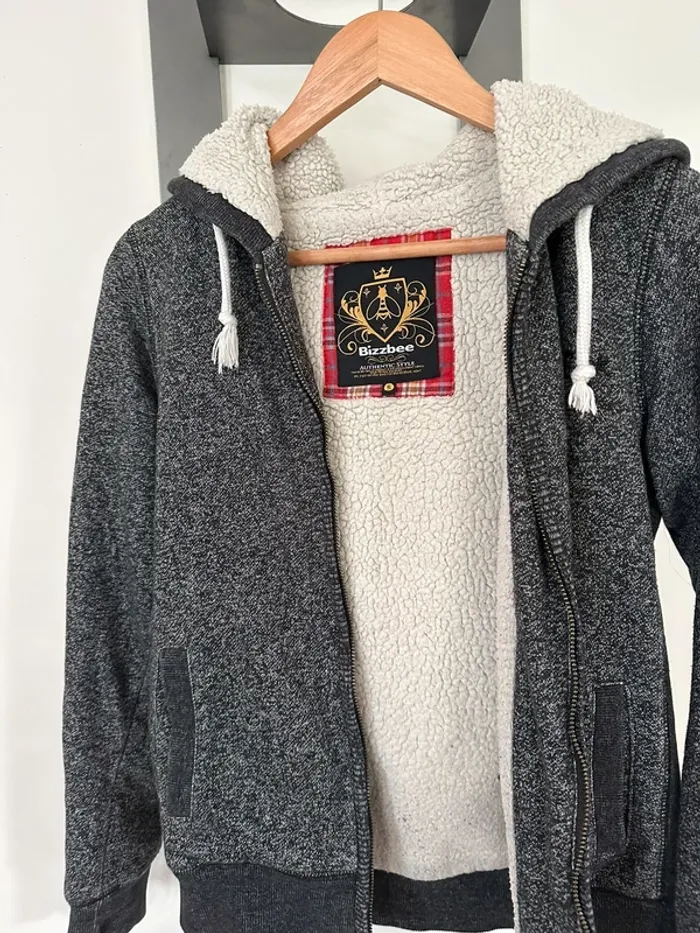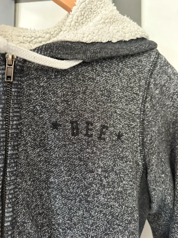 Gilet bizzbee gris avec moumoute dans la capuche et l’intérieur du gilet sauf les manches, taille S, très bon etat