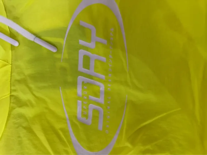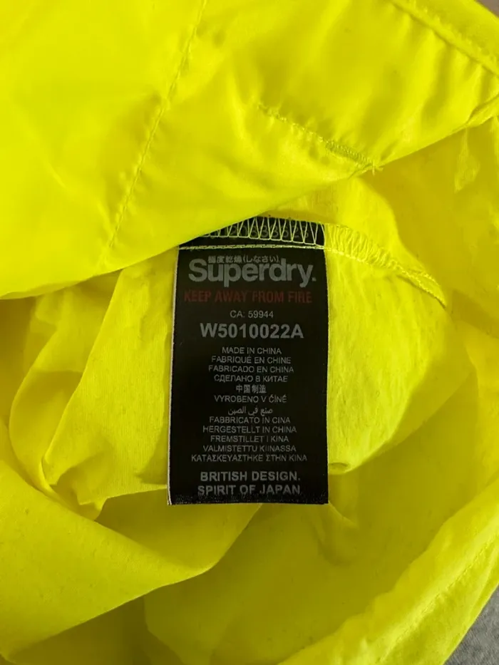 K-way superdry jaune fluo, taille M, neuf sans étiquette, il n’a jamais été mis car trop grand mais ma mère m’a coupé l’étiquette avant que je puisse l’essayer