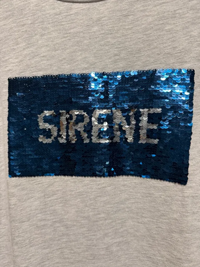 teeshirt bizzbee gris réversible sur le devant avec un côté écrit sirène et de l’autre écrit licorne, taille S, très bon état, porté que quelques fois