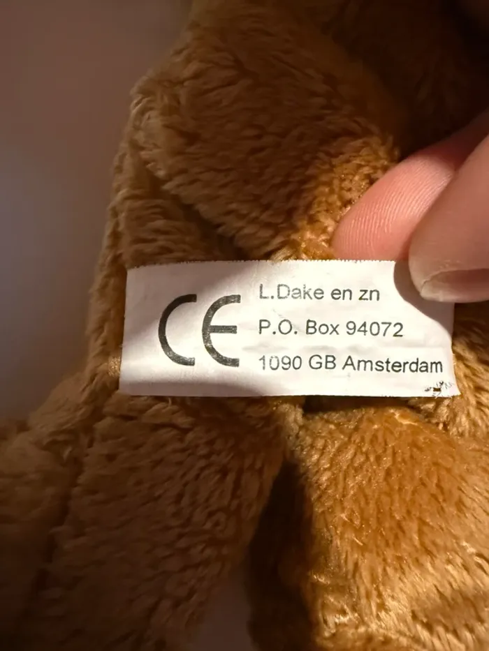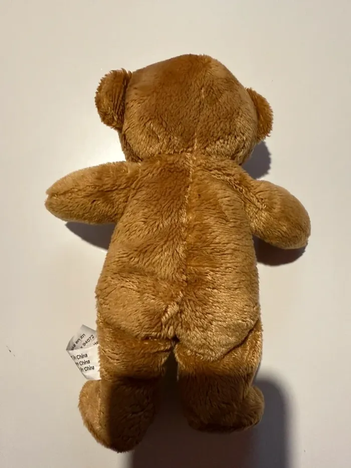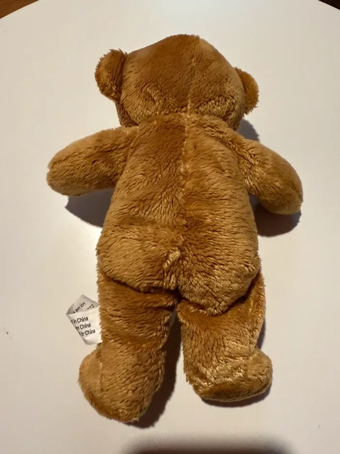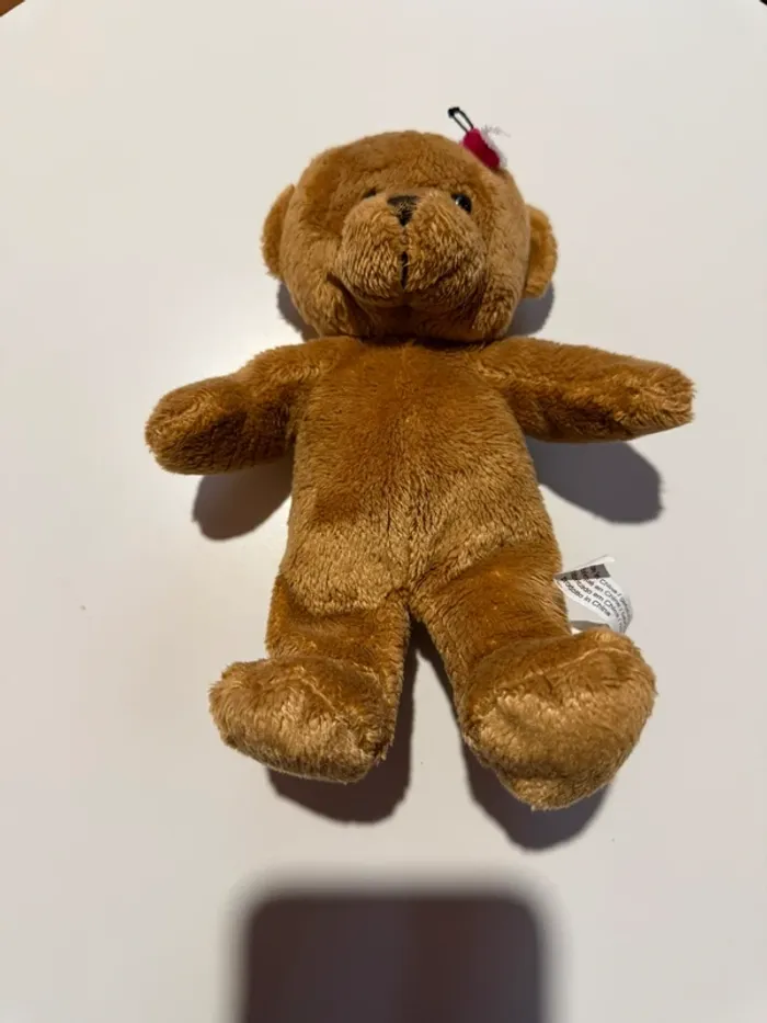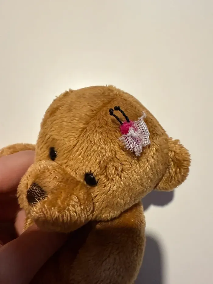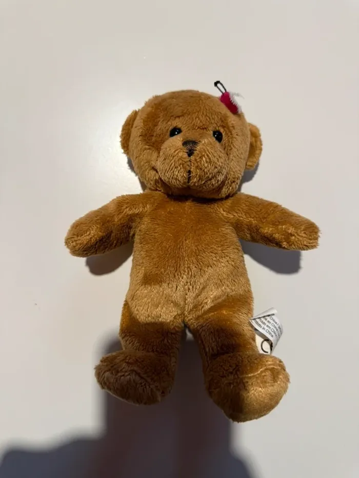 Peluche ourson marron avec petit papillon rose et blanc sur la tête, très bon état