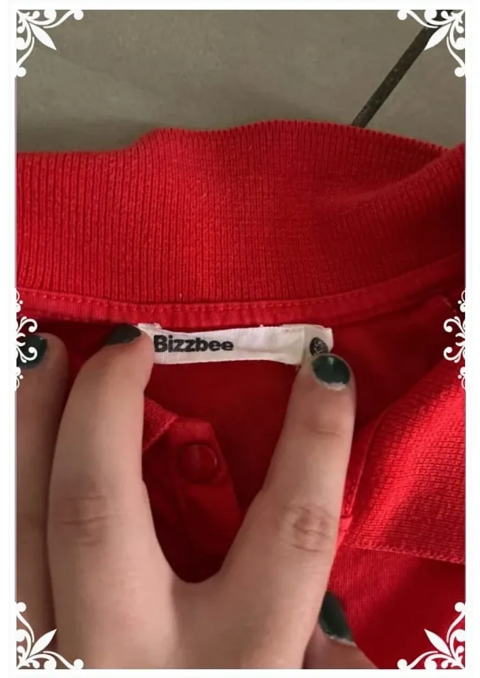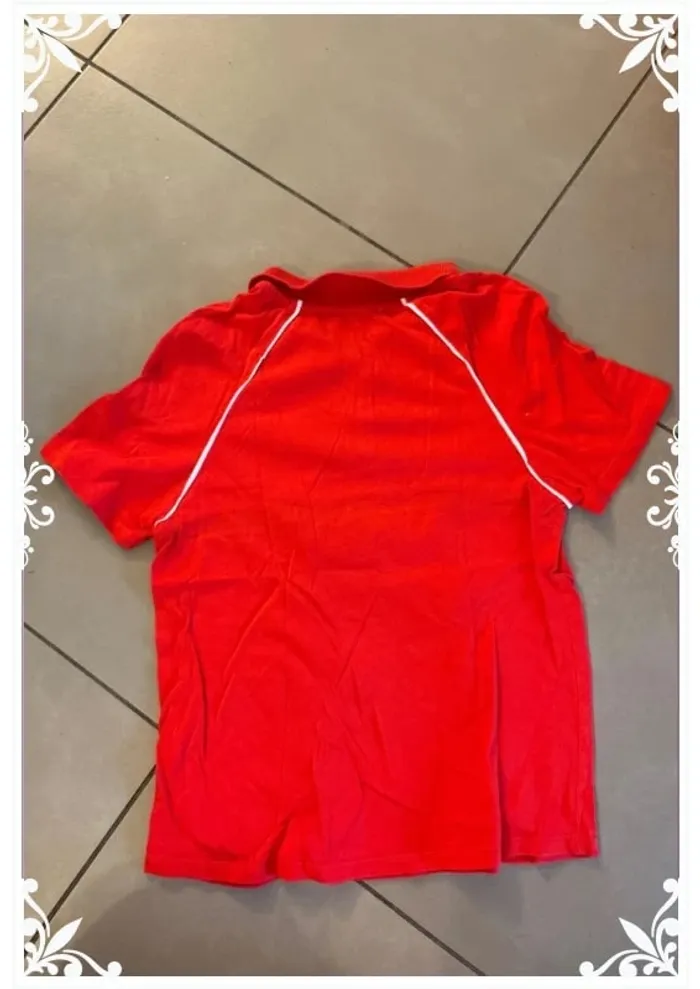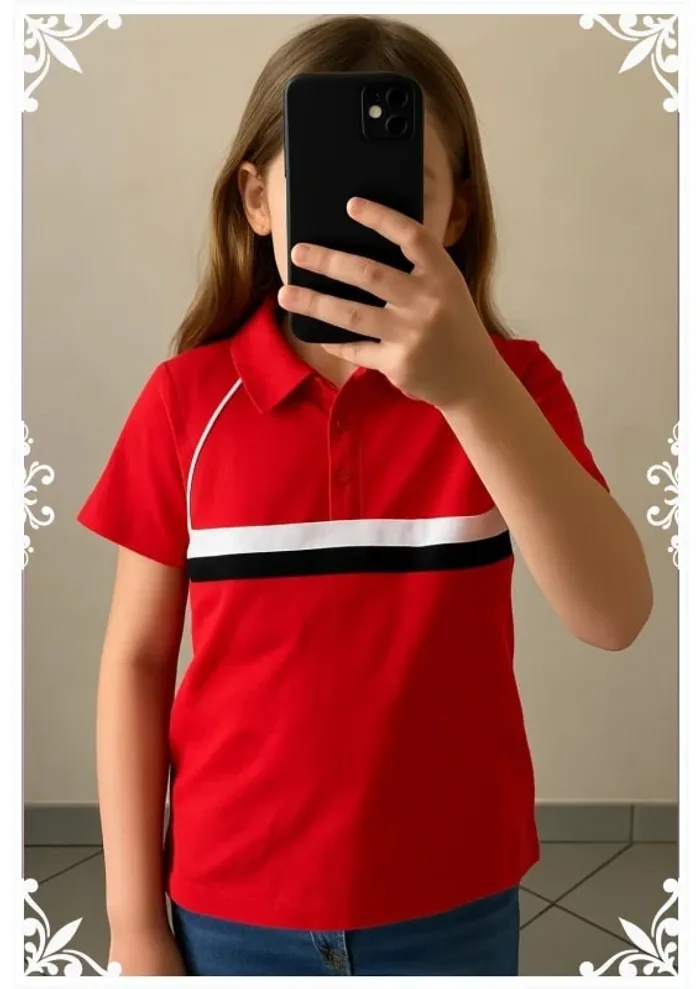 #lesliemp_fille #lesliemp_10ans Polo à manches courtes de couleur rouge vif, orné de deux bandes horizontales contrastantes (blanche et noire) au niveau de la poitrine. Coupe classique avec col polo et patte de boutonnage à trois boutons. Matière légère et confortable. Idéal pour un look sportif et décontracté.