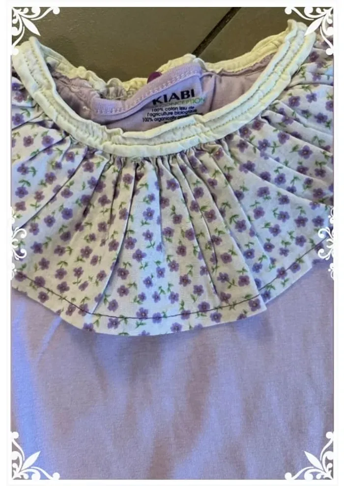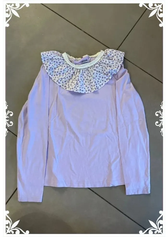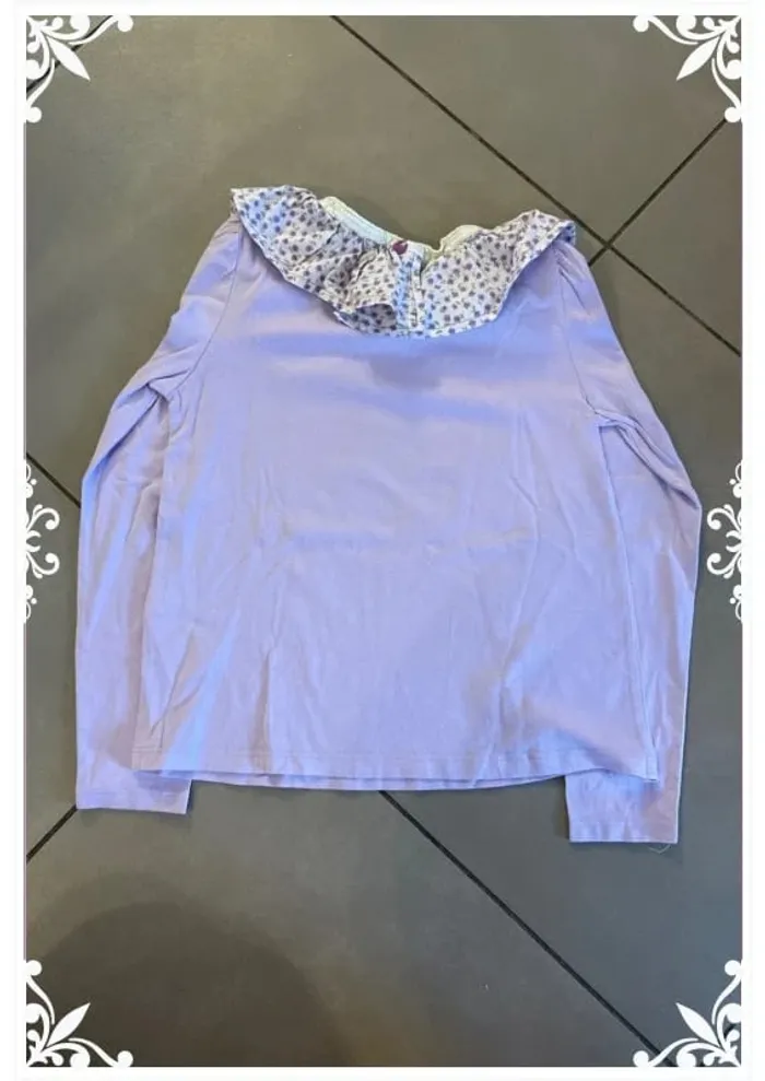 #lesliemp_fille #lesliemp_10ans T-shirt à manches longues en coton doux, de couleur parme pastel. 💜 Col Claudine oversize en tissu fleuri (violet, rose et vert) à volants, orné de dentelle blanche pour une finition romantique et élégante. Parfait pour un look chic et confortable au quotidien ou pour les occasions. Très bon état.
