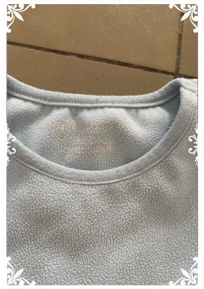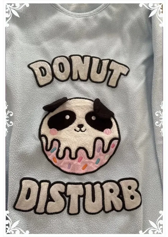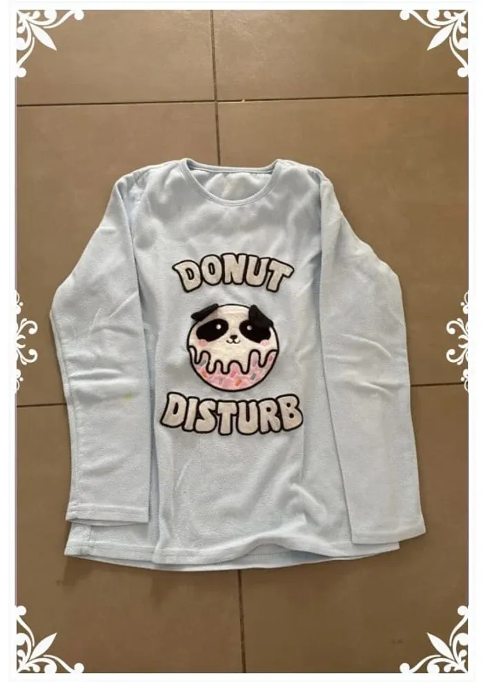 #lesliemp_fille #lesliemp_10ans Craquant et ultra doux, ce pyjama deux pièces est parfait pour des nuits tout en confort et en bonne humeur ! 💙 Haut bleu ciel manches longues avec un adorable motif panda "Donut Disturb" en relief, aussi rigolo que moelleux 💜 Pantalon à taille élastique au dégradé pastel rose-lilas-blanc, pour une touche féérique et tendance 💤 Matière toute douce style pilou ✨ En bon état, prêt à enchanter les soirées cocooning 🌙 Idéal pour les fans de pandas et les rêves sucrés ! Tache sur le devant du t-shirt et du pantalon en photo