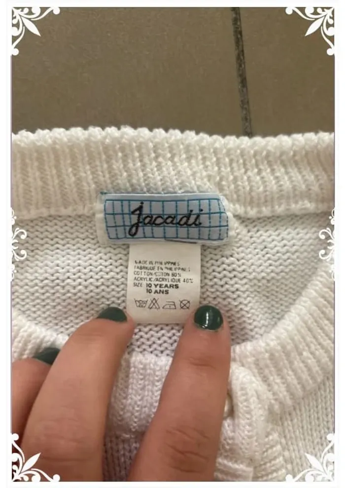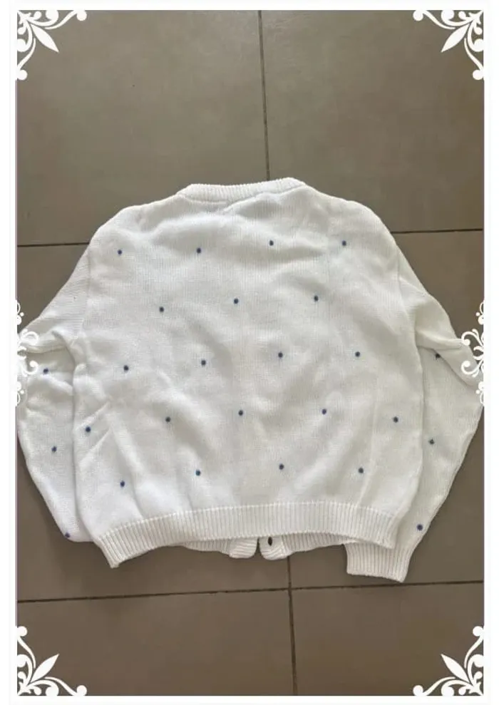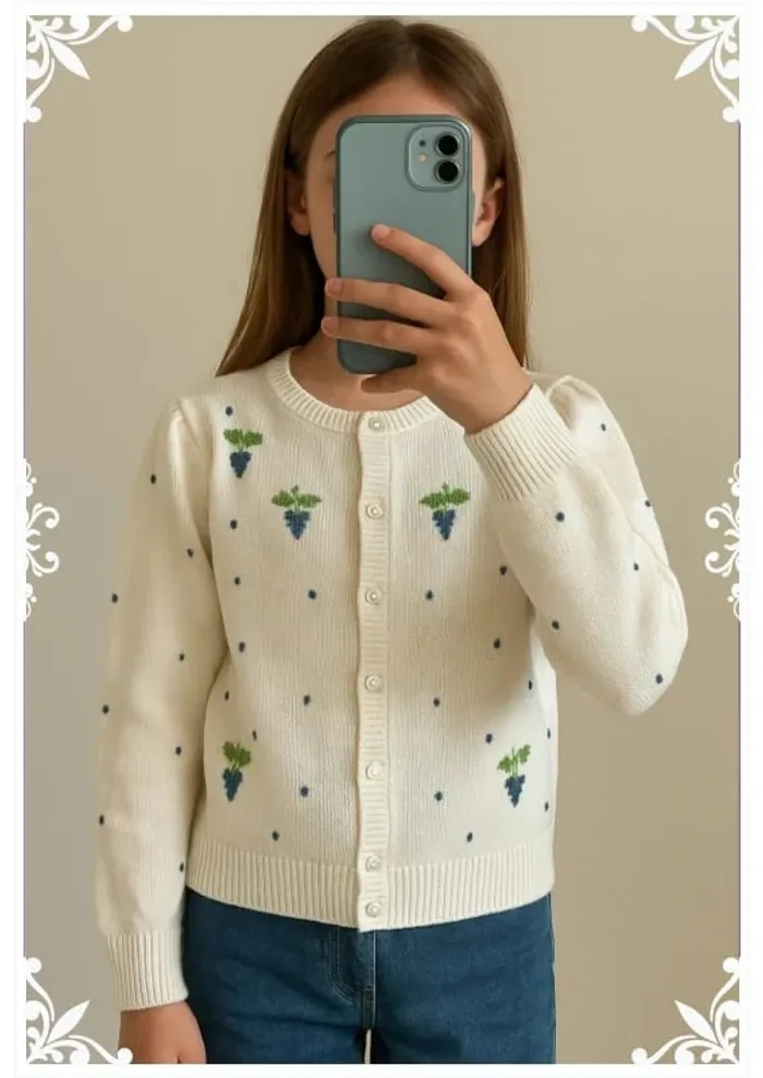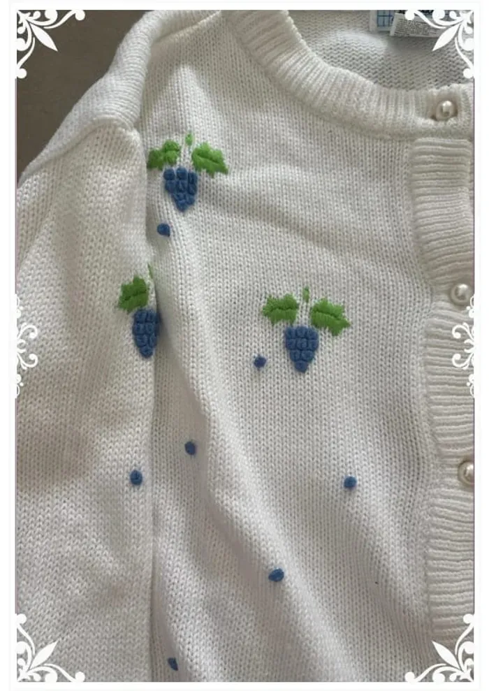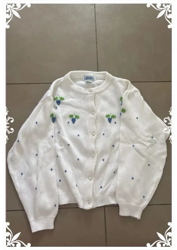 Un petit bijou de douceur et de raffinement signé Jacadi ! Ce gilet blanc en maille fine est orné de ravissants motifs de grappes de raisin brodés en bleu et vert, qui apportent une touche de fraîcheur et d’originalité. Fermeture par boutons nacrés, coupe confortable et finitions soignées.