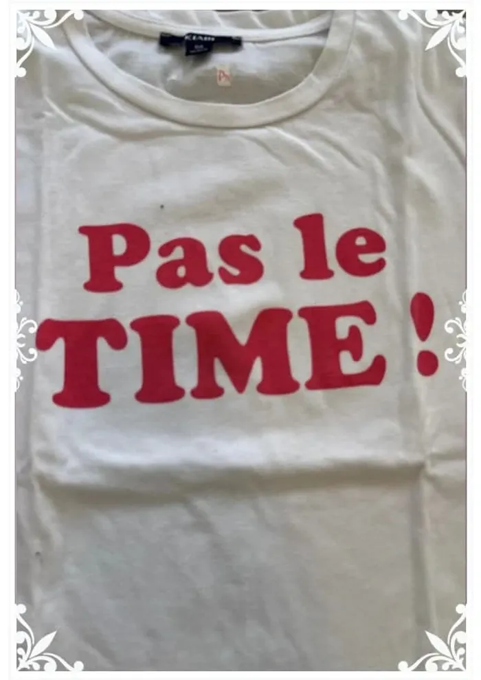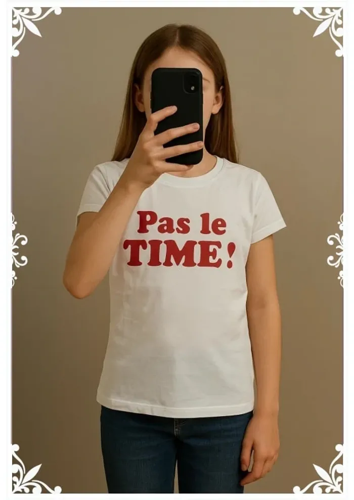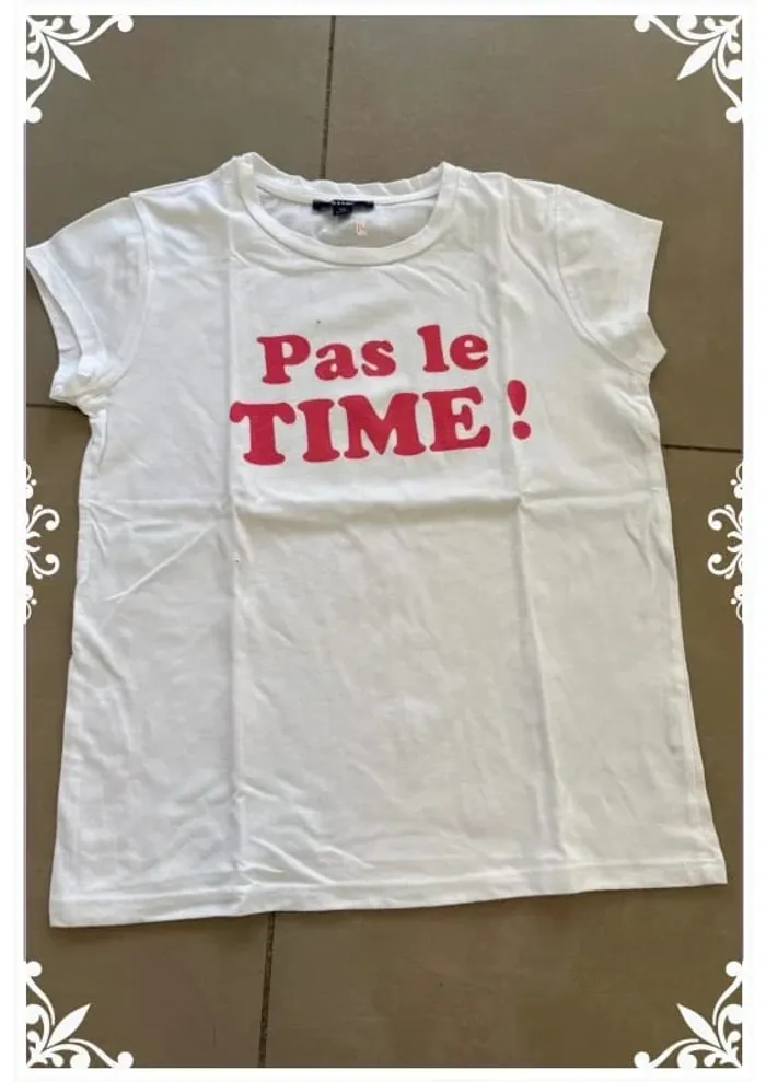 #lesliemp_fille #leslie_12ans Un look plein de caractère pour les filles qui savent ce qu’elles veulent 💥 Ce T-shirt blanc Kiabi taille 12 ans affiche fièrement le slogan “Pas le TIME !” en lettres rouges, pour une attitude fun et déterminée ! Parfait pour affirmer son style à l’école ou en sortie. 👕 Coupe classique, col rond 🧵 100% coton doux et confortable 🔤 Imprimé tendance rouge vif 📏 Taille 12 ans – bien taillé 📦 Très bon état, peu porté À porter avec un jean, un short ou une salopette pour un look cool et décontracté 🎒 Maison non fumeur – Envoi rapide 📬