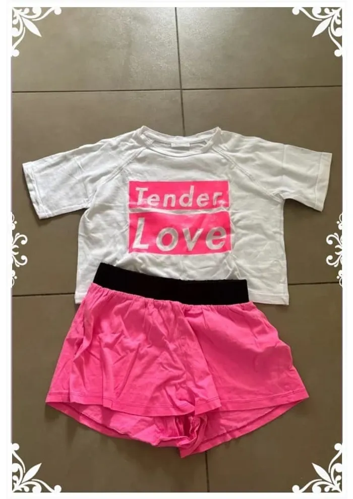 #lesliemp_fille #lesliemp_10ans Craquant pyjama d'été 2 pièces pour fille, taille 10 ans, de la marque Fun&Fun. Le haut blanc oversize mais croc est orné d’un message fun et flashy "Tender Love" en rose fluo, pour faire le plein de bonne humeur au coucher 🌈 Le short assorti rose vif, à large taille élastique noire, est ultra confortable et stylé 💕 Parfait pour les chaudes nuits d'été ou les matinées cocooning à la maison ! 🧼 En excellent état 🚫 Pas de taches, pas de trous 👧 Taille : 10 ans 🏷 Marque : Fun&Fun 💌 Envoi rapide et soigné – N'hésitez pas à regrouper vos achats pour réduire les frais de port !