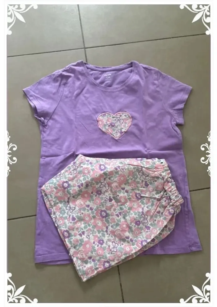 💜 Pyjama été fille – Taille 12 ans – Haut brodé Kiabi & short fait main