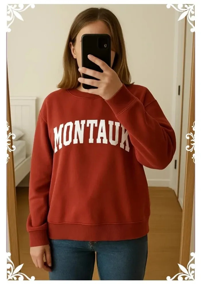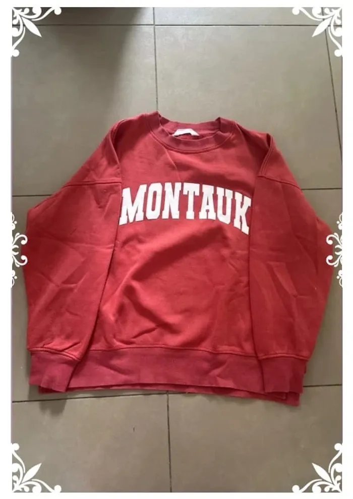 #lesliemp_femme Sweat-shirt rose corail avec inscription blanche "MONTAUK" en grand sur le devant, esprit campus américain. Coupe droite légèrement loose, matière molletonnée très agréable à porter. Idéal pour un look casual ou cocooning. 🔸 Taille : XS 🔸 État : très bon état, peu porté 🔸 Matière : coton majoritaire, doux à l’intérieur 🌟 Envoi rapide et soigné 📩 Me contacter si vous avez des questions ou souhaitez d’autres photos !