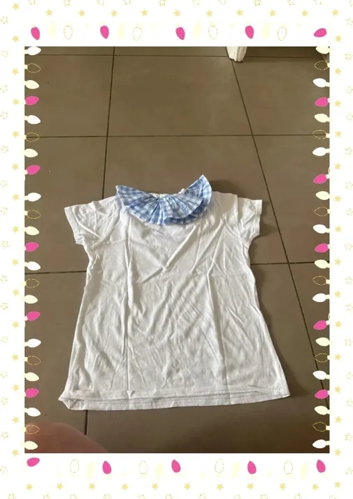 💙 T-shirt blanc 12 ans – Col vichy bleu cousu main, modèle unique ! 💙 - photo numéro 1