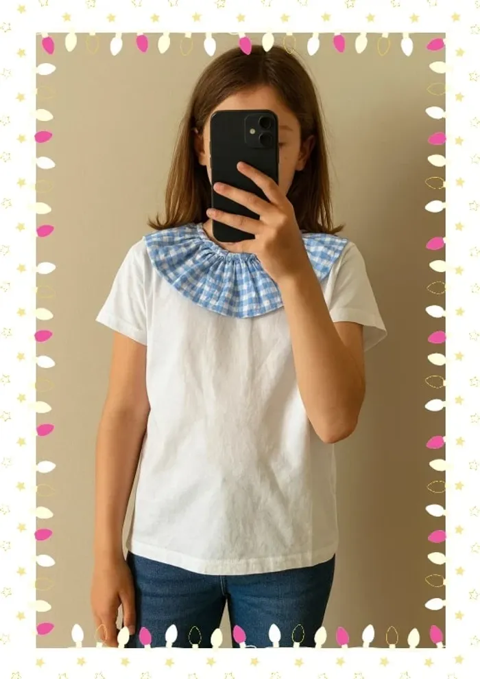 💙 T-shirt blanc 12 ans – Col vichy bleu cousu main, modèle unique ! 💙