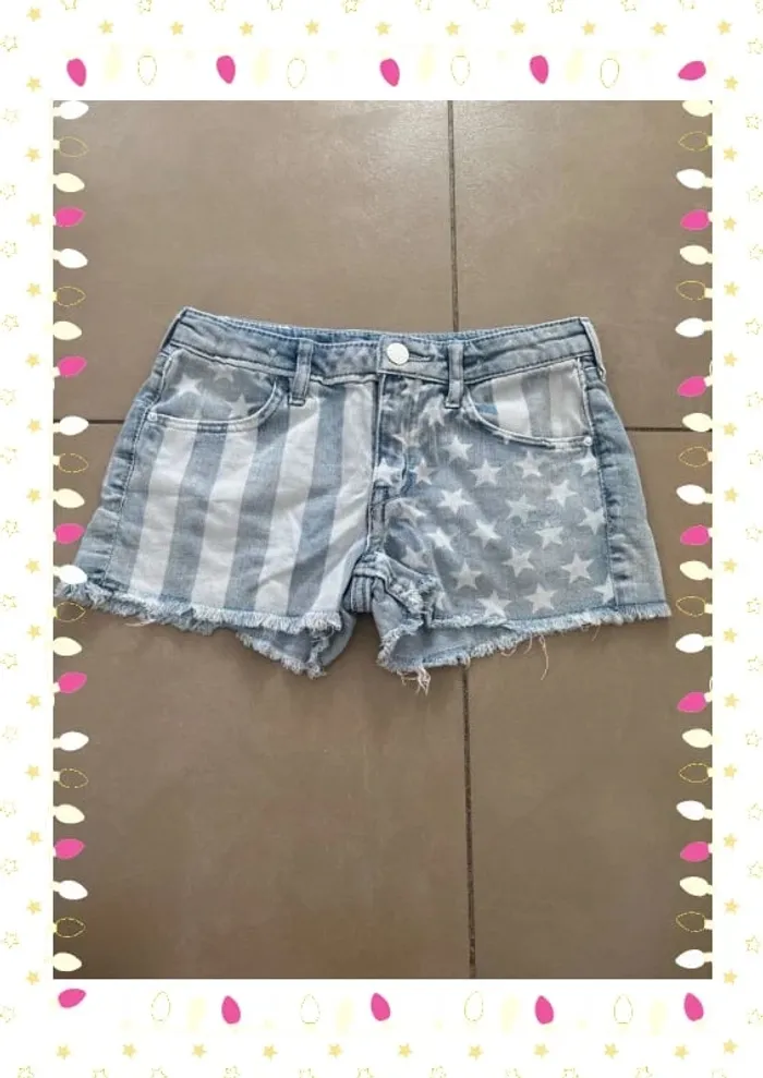 #lesliemp_fille #lesliemp_10ans Faites sensation cet été avec ce short en jean au motif drapeau américain revisité ! 🇺🇸 Effet délavé, étoiles et rayures ton sur ton, bords effilochés pour un look bohème rock irrésistible. ✨ Taille S/M – coupe courte, taille mi-haute 🪡 Matière jean souple, confortable 🧵 Très bon état, porté mais bien entretenu Parfait pour vos festivals, looks casual ou vibes summer 🌞 📦 Envoi rapide & soigné H et m ou Zara ?