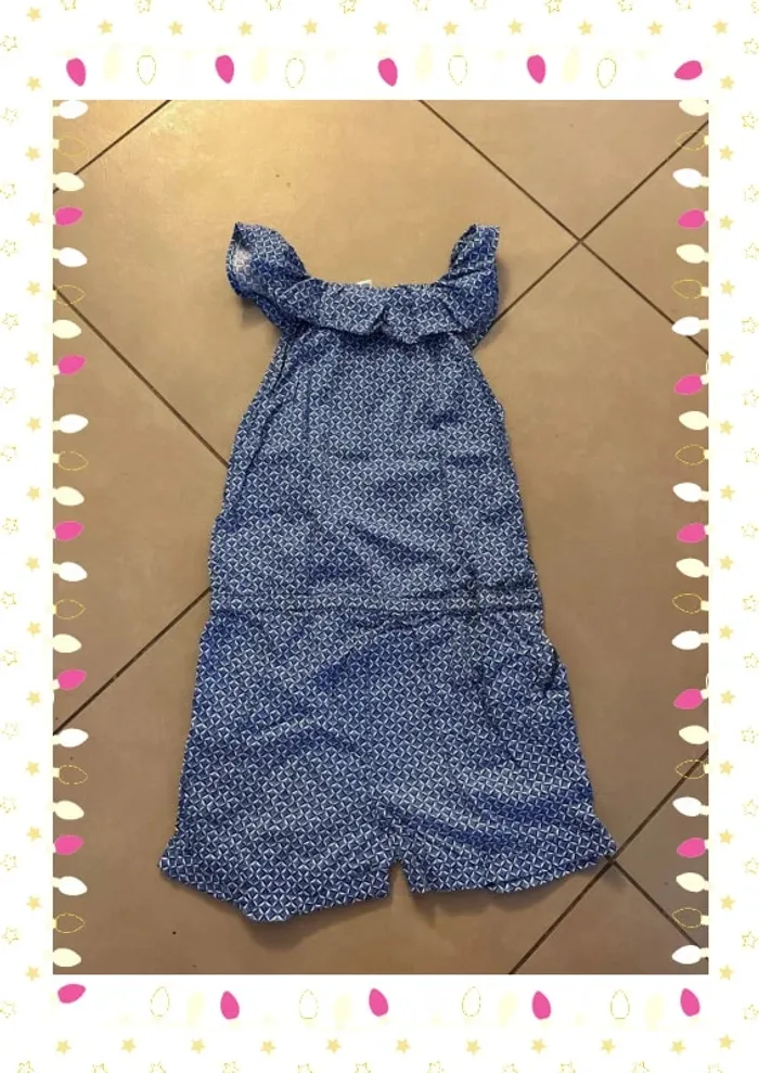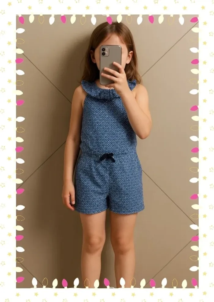 Ultra pratique et plein de charme, ce combishort Okaïdi bleu à motifs géométriques blancs est idéal pour les journées ensoleillées. Léger, fluide et confortable, il offre une coupe décontractée tout en restant élégant grâce à son joli col volanté et son lien à nouer à la taille. Parfait pour jouer, se balader ou profiter des vacances, il se porte aussi bien avec des sandales que des baskets pour un look frais et tendance. #lesliemp_fille #lesliemp_8ans