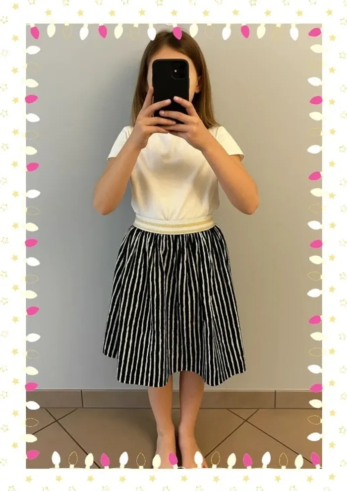Craquez pour cette jolie jupe à imprimé rayures noires et blanches au look dynamique et tendance. Sa taille élastique blanche ornée de fines touches dorées apporte une note chic qui s’adapte aussi bien à une tenue décontractée qu’à un look plus habillé. Confortable et facile à porter, elle tourbillonne à chaque pas pour un effet plein de pep’s. Idéale pour le printemps, l’été ou les cérémonies, elle deviendra vite un indispensable du dressing. #jupefille #vintedkids #modeenfant #taille12ans #lookfille #vêtementsfille #été #printemps #tenuechic #modefille #lesliemp_fille #lesliemp_12 ans