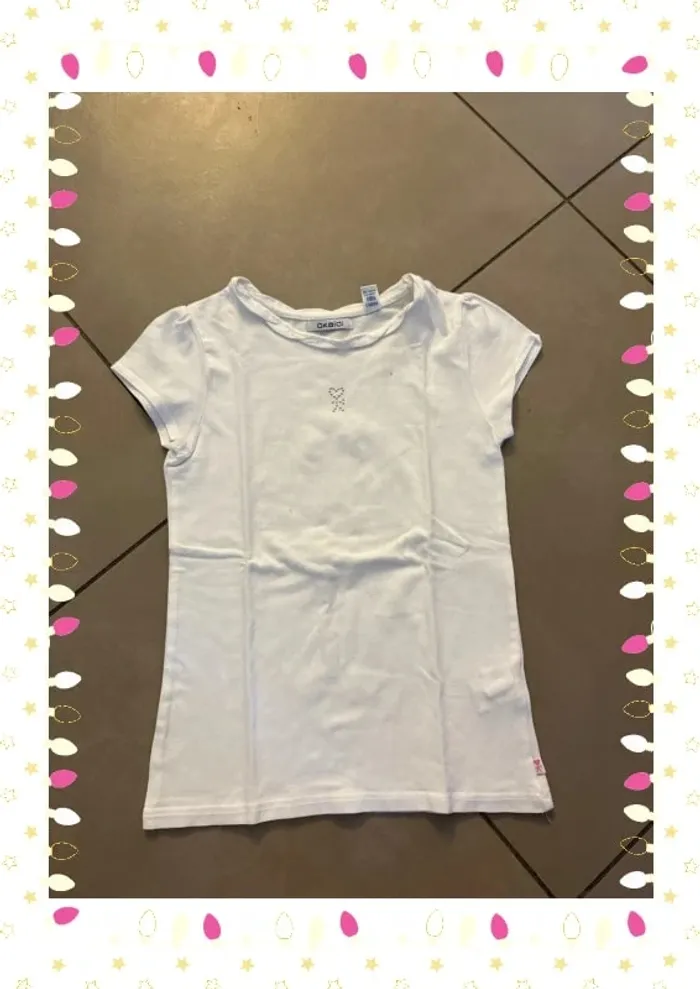 Indispensable dans la garde-robe ! Ce joli T-shirt blanc Okaïdi, taille 8 ans, est simple, élégant et facile à assortir à toutes les tenues. 👕 Matière douce et confortable, manches courtes, petit motif discret sur la poitrine. ✨ Parfait pour l’école, les sorties ou les journées estivales. 📦 En très bon état, prêt à rejoindre un nouveau dressing ! #lesliemp_fille #lesliemp_8ans