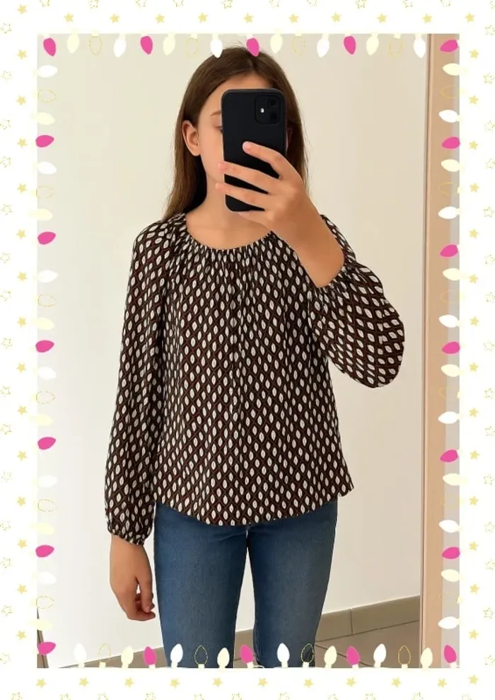 🌿 Chemisier fille 10 ans – pièce unique fait main – imprimé graphique marron & blanc - photo numéro 1