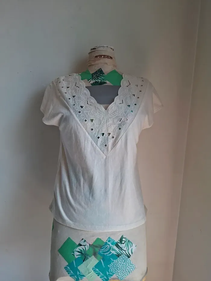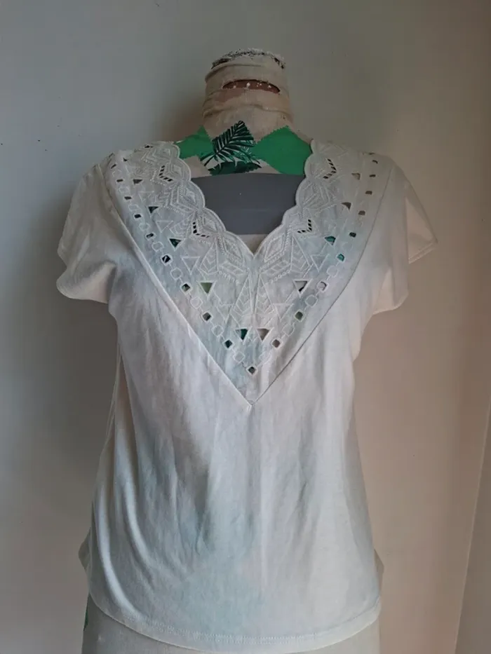 Top blanc brodé en coton, col V romantique - neuf, taille S - photo numéro 2