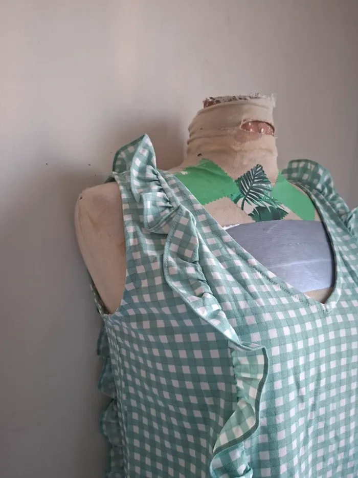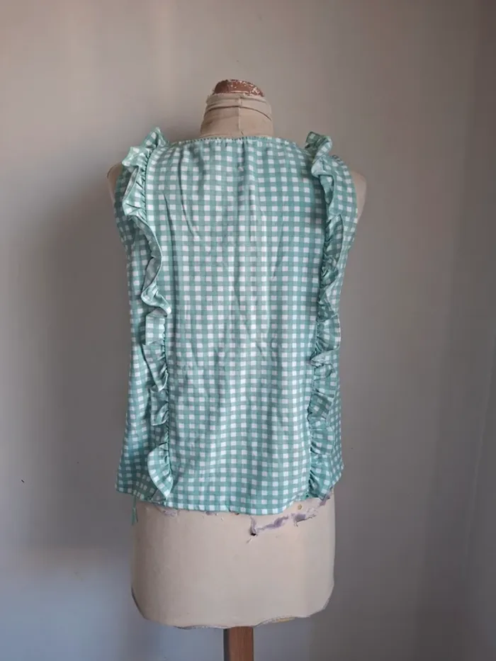 Top vert vichy Michelle Mcdowell, neuve, taille M, parfait pour la mi-saison Matière 90% polyester, 10% spandex Aisselle à aisselle 48cm, épaule à épaule 31cm, longueur 57cm #taillem_sofaia971 #hautfemme #hautvichyfemme #top#vichy #vert #rétro #volants #été #printemps #mode #femme #tendance #débardeur #tanktop #régata #camisetasinmangas #canotta