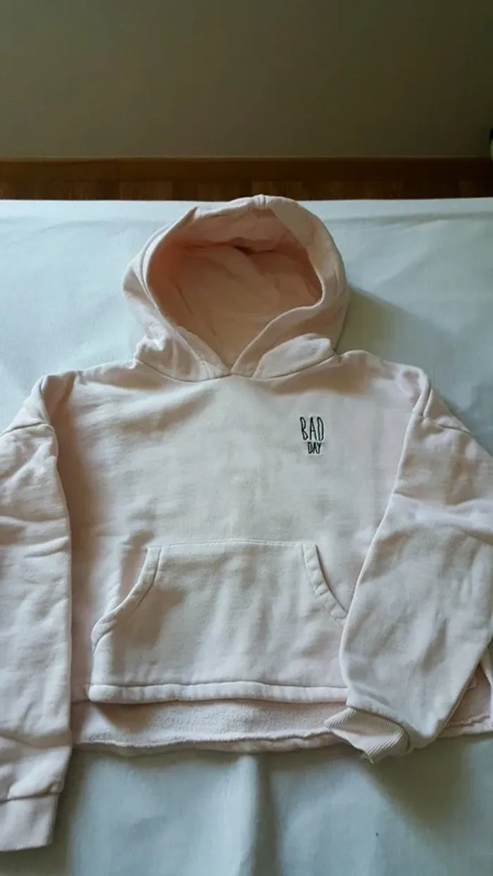 Sweat court à capuche Couleur rose clair Présente 2 toutes petites tâches à l' arrière d' un bras. Taille 12 ans