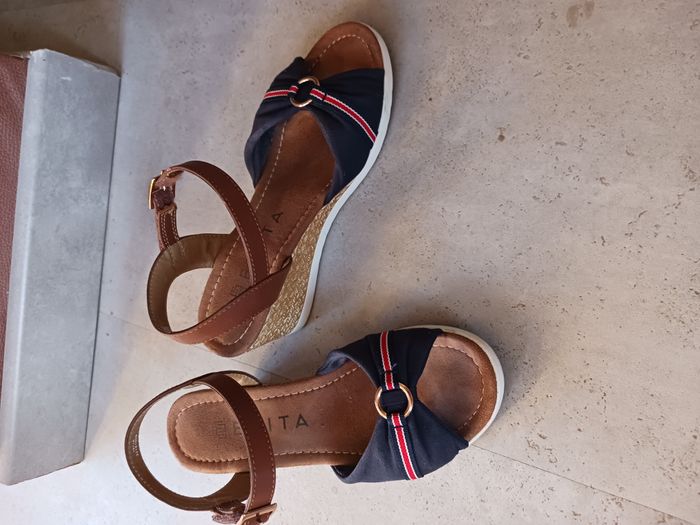 Sandales talons compensés 37 marine rouge et blanche Evita