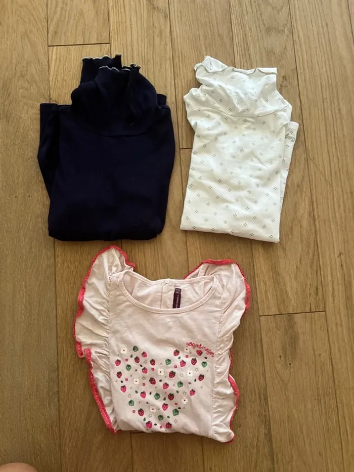 Bonjour, Je vends le lot de 3 hauts sergent major en taille 11 ans 2 col roulé quasi neuf porté 1 ou 2 fois 1 tee shirt manche courte très bon état Acheté neuf 44,97€