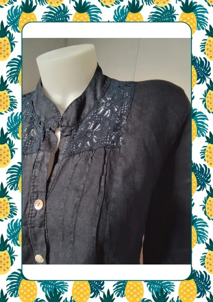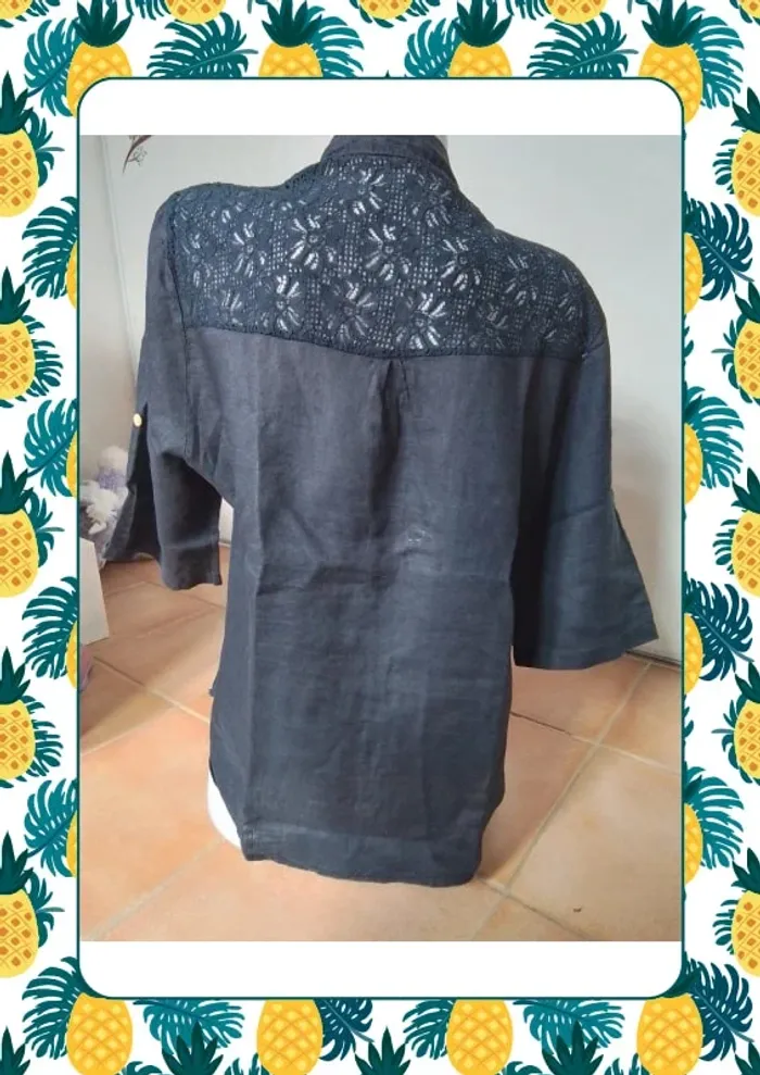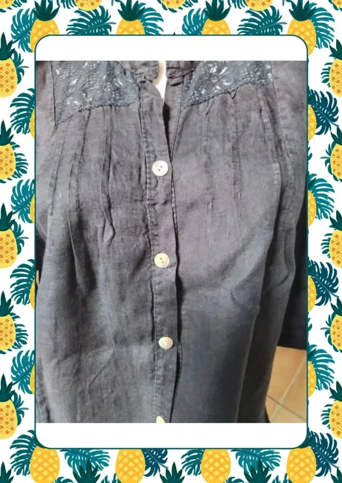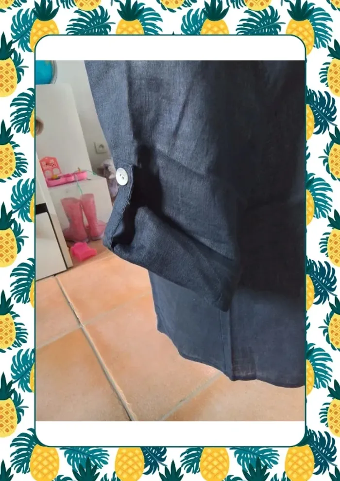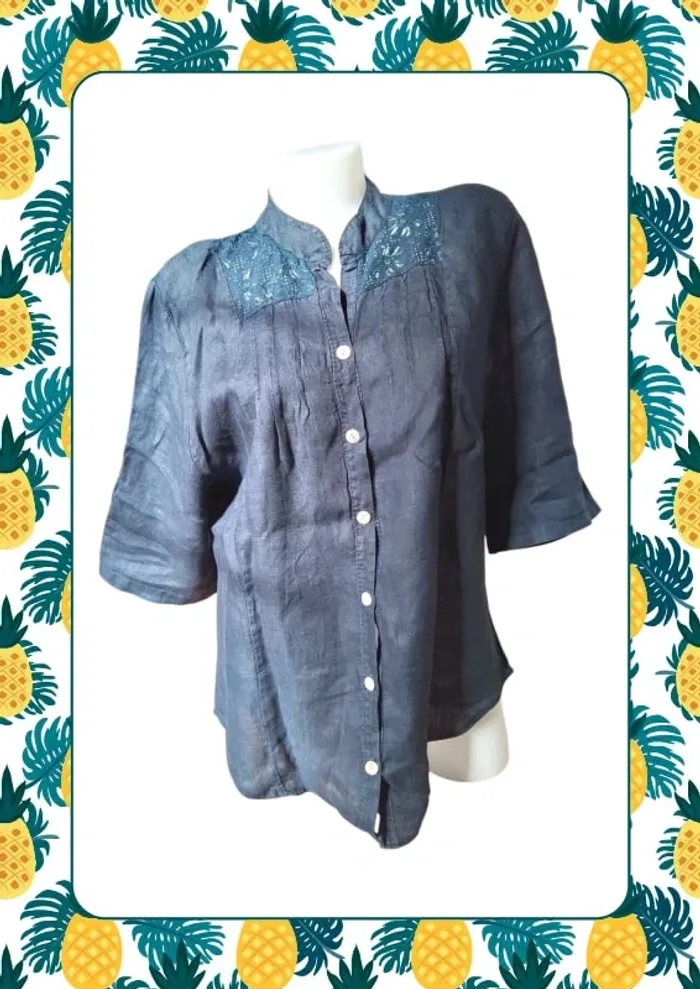 Chemise manche courte avec possibilité de faire des revers grâce au bouton et pan qui se reboutonne Sans étiquette mais matière en lin un peu transparente Dimension D’une aisselle à l autre 58cm Du haut de l’épaule au bas au plus court du côté 61 cm et au plus long devant 72cm