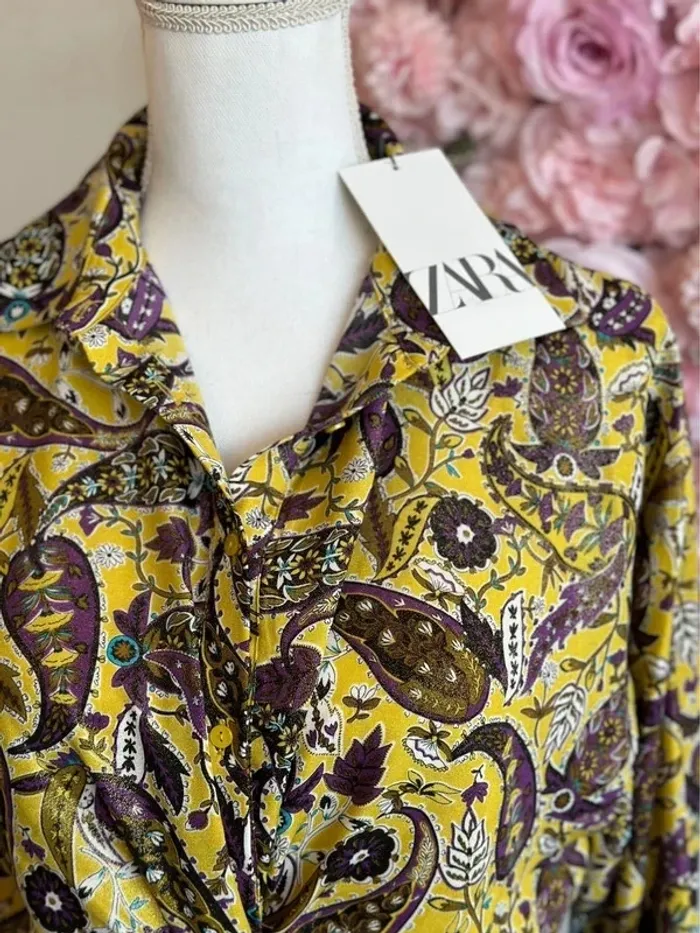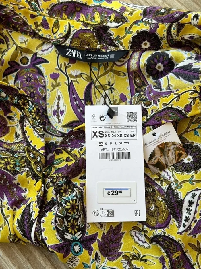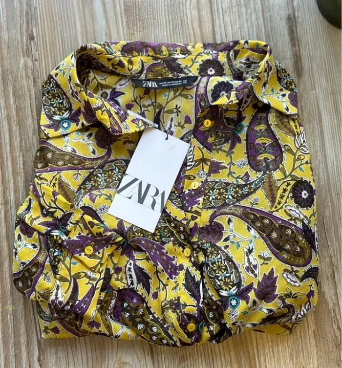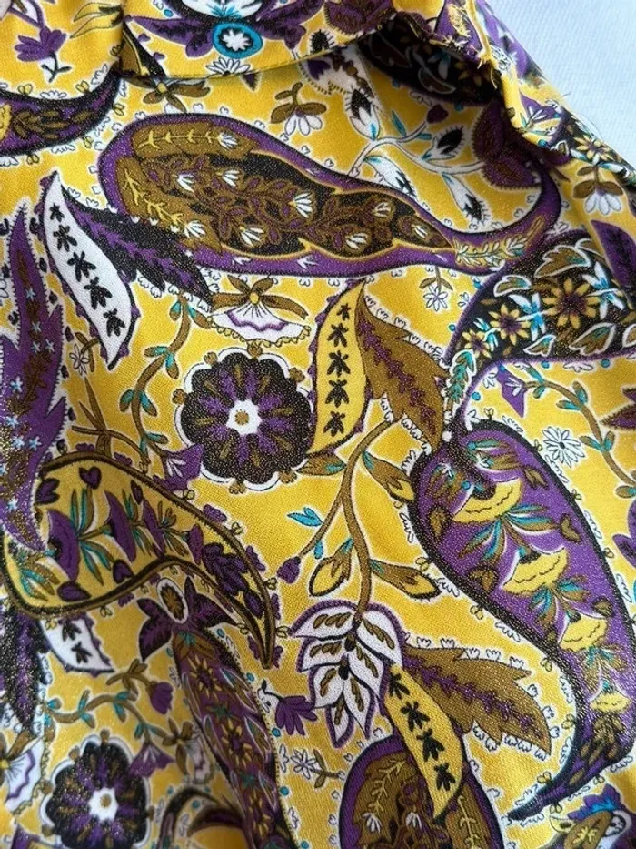 Belle blouse chemise neuve avec étiquette. Elle arbore un joli imprimé brillant en jaune et violet avec des motifs cachemire/paisley. La taille XS est bien ajustée.