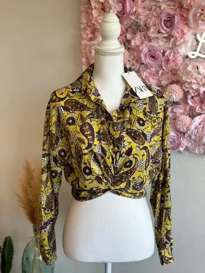 Blouse courte imprimé cachemire paisley jaune et violet, taille XS - Zara