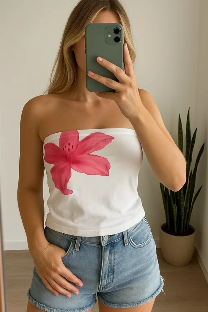 Top bustier blanc léger avec imprimé floral rouge et rose, coupe ajustée et féminine. Tissu agréable à porter, idéal pour un look estival ou une tenue plus habillée selon l’association. Neuf sans étiquette, la taille S convient bien. ℹ️ Photo portée générée à titre illustratif, pour vous donner une idée du rendu.