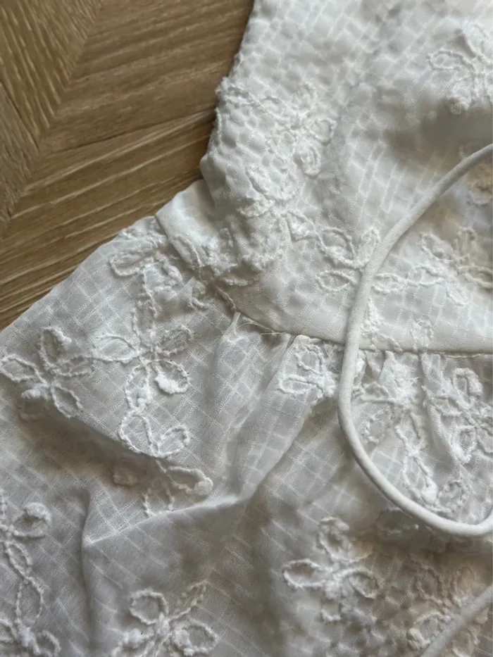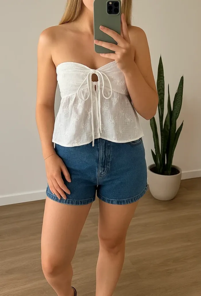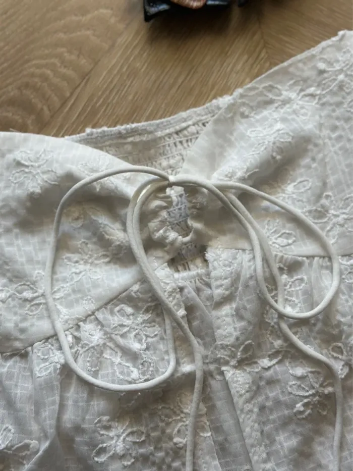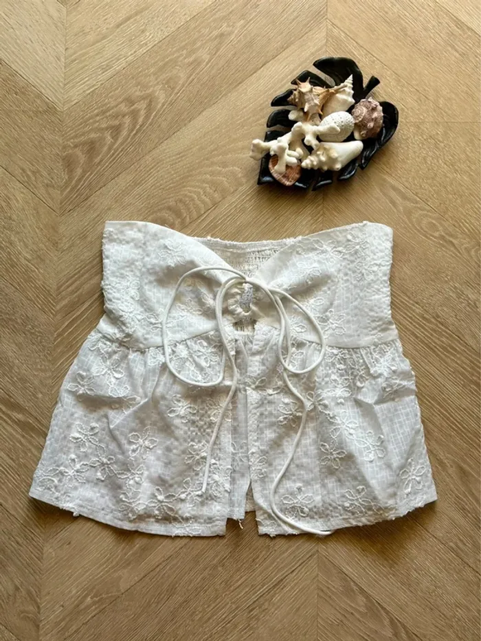 Top blanc façon bustier avec broderie florale, coupe ajustée et liens à nouer au niveau du décolleté. Léger, tendance et agréable à porter, il est doublé au niveau de la poitrine pour éviter toute transparence. Style féminin et estival, facile à associer avec un jean ou une jupe. Neuf sans étiquette, la taille XS/S convient bien. ℹ️ Photo portée générée à titre illustratif, pour vous donner une idée du rendu.