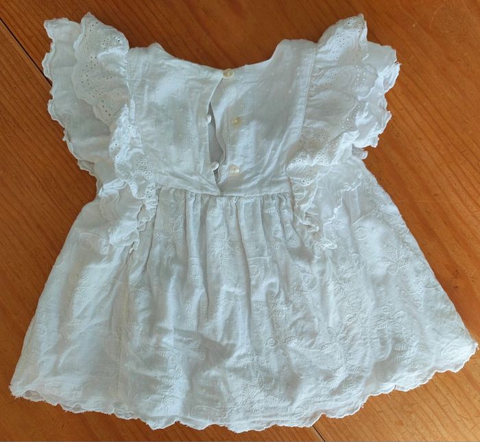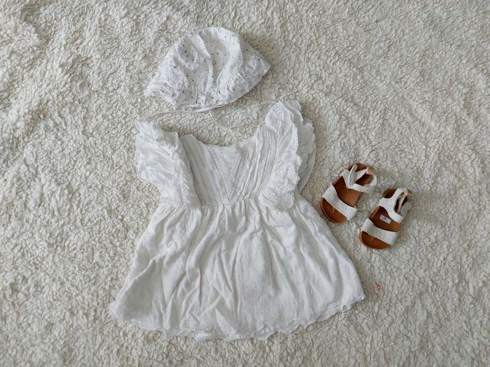 Taille 6-9 mois. En très bon état, il y a juste une tâche devant (voir photo 3). Vendu avec un chapeau kiabi taille 45, et une paire de sandales tao taille 6-12mois. D'autres articles ici : #julam1994_taille_6mois
