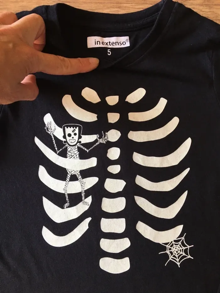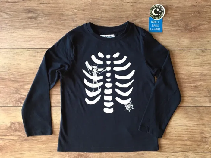 Tee-shirt manches longues noir avec motif squelette phosphorescent (brille dans la nuit), taille 5 ans, de marque In Extenso. Idéal pour Halloween. Neuf, sans étiquette. Maison non fumeurs et sans animaux. Envoi rapide et soigné.