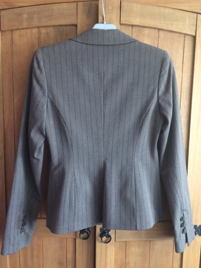 Veste de tailleur rayée marron/gris chiné, de marque Xanaka, T 34, neuve jamais portée. Maison non fumeurs et sans animaux. Envoi rapide et soigné.
