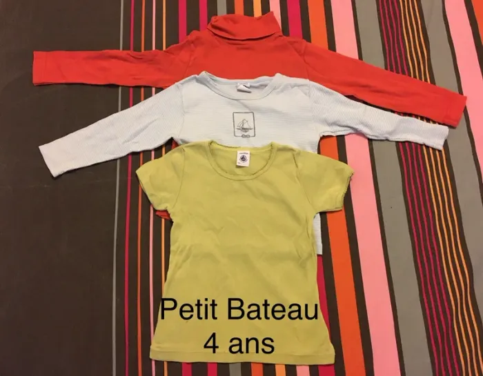 Lot de 3 tee-shirts/maillots de corps Petit Bateau, taille 4 ans. Un tee-shirt manches courtes et 2 tee-shirts manches longues dont un à col roulé. En bon état. Maison non fumeurs et sans animaux. Envoi rapide et soigné.