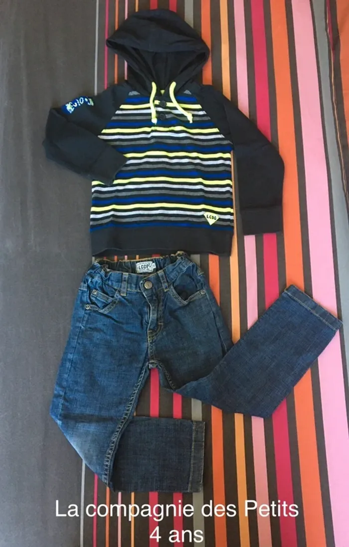 Ensemble jeans (à taille réglable élastiquée) et tee-shirt manche longue à capuche, taille 4 ans, de marque la Compagnie des petits. En très bon état car peu porté. Maison non fumeurs et sans animaux. Envoi rapide et soigné.