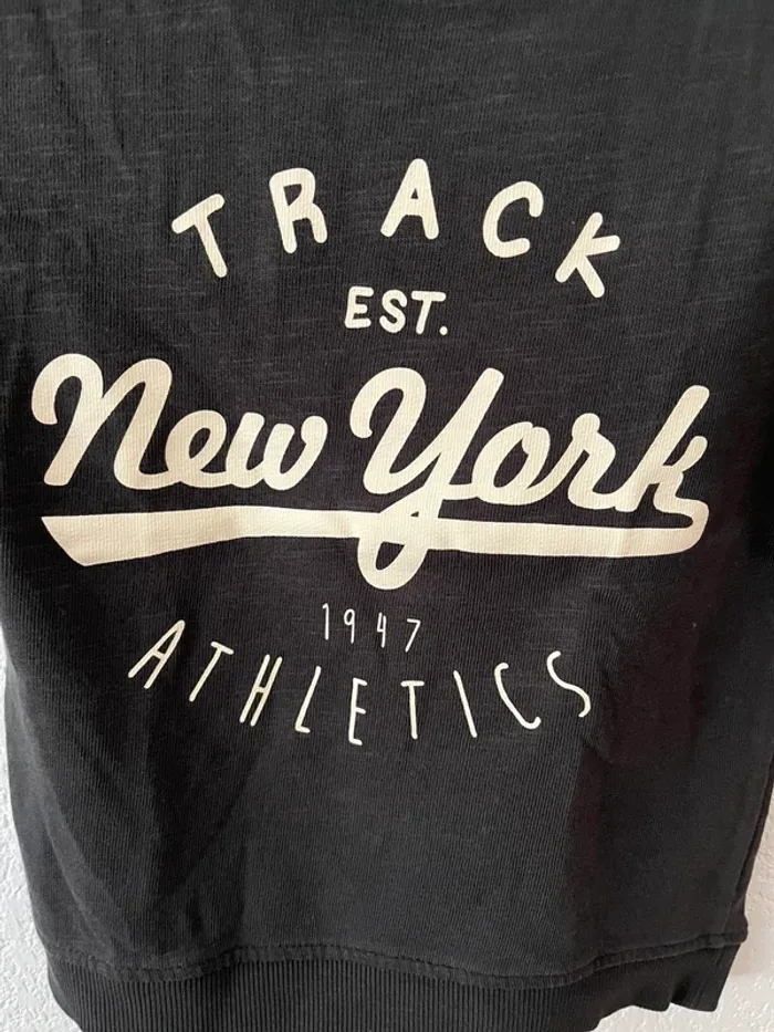 Sweat à manches longues H&M pour garçon, coloris gris foncé, avec inscription “Track – New York Athletics” sur le devant. ✔ Taille : 2 ans (92 cm) ✔ Ouverture pressionnée à l’épaule pour un enfilage facile ✔ Confortable et pratique pour tous les jours ✔ En très bon état, aucune tache ni défaut à signaler.