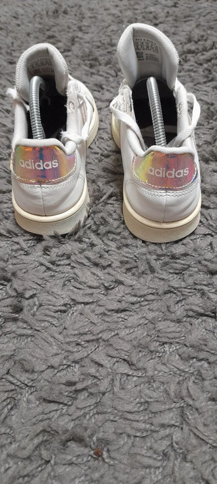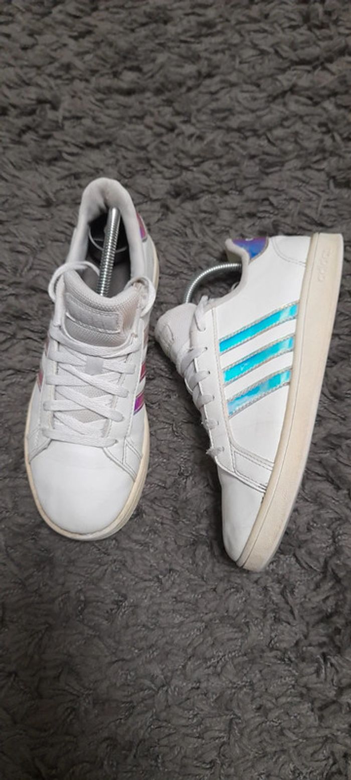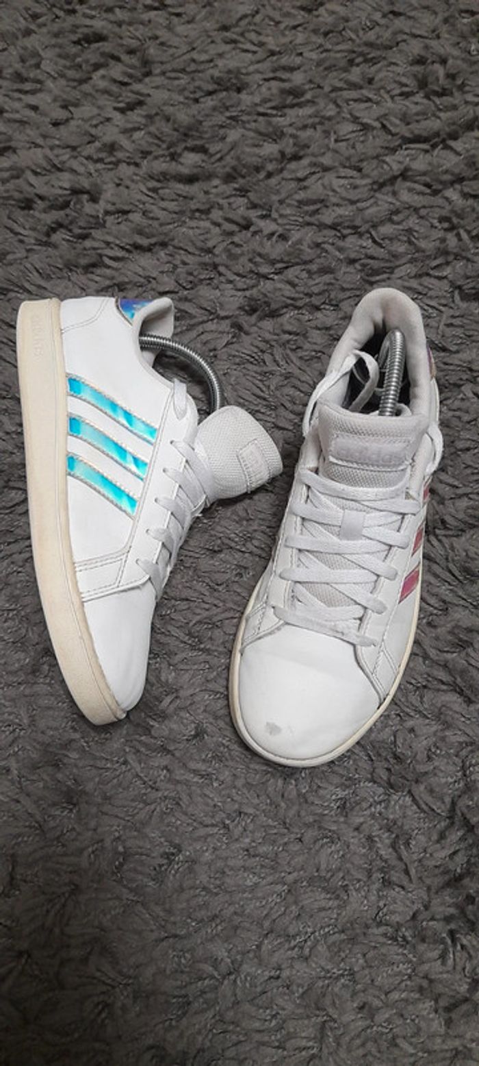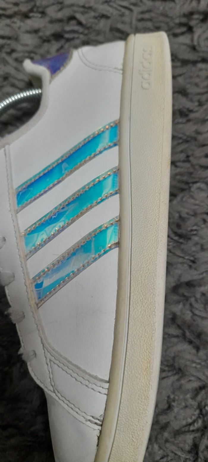 Paire de basket de la marque Adidas modèle Grand Court Lifestyle. Taille 36. Couleur blanche Iridescent (brillant avec reflets métallisés). En bon état général (usure sur l'intérieur voir photo) #BASKET36_vanesslavaness #basket36 #basketadidas36