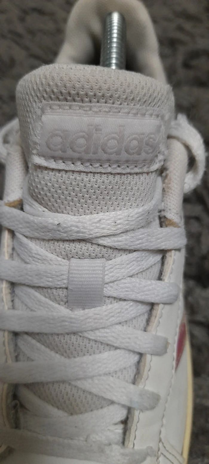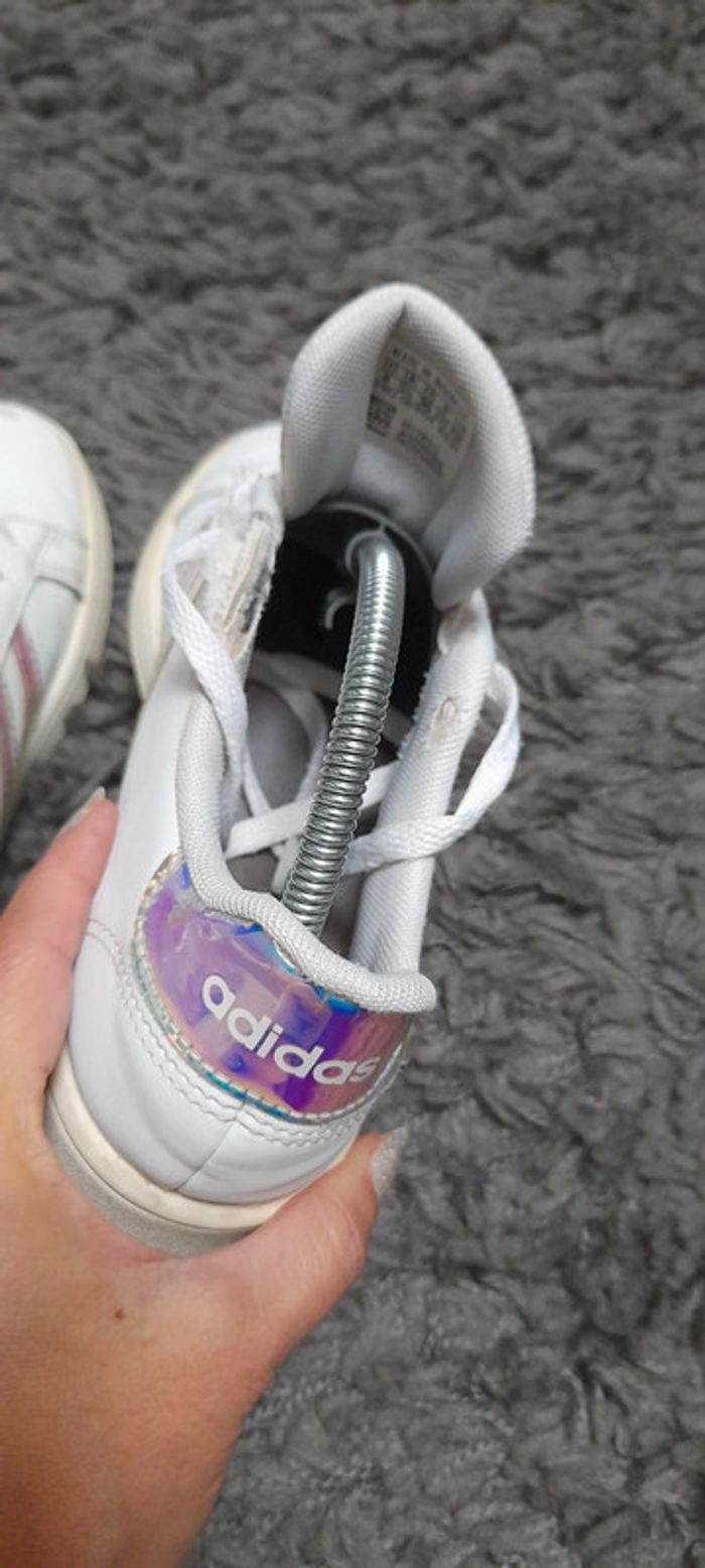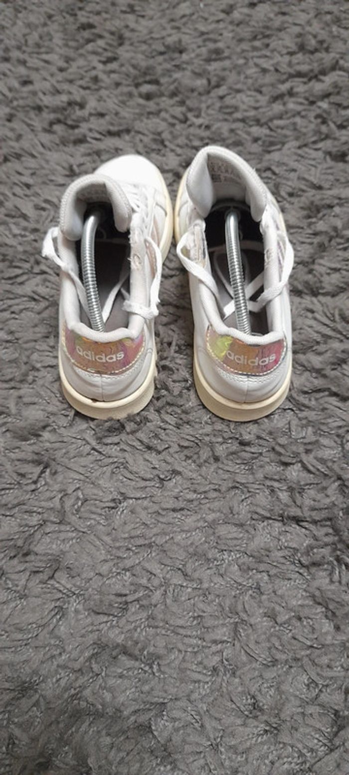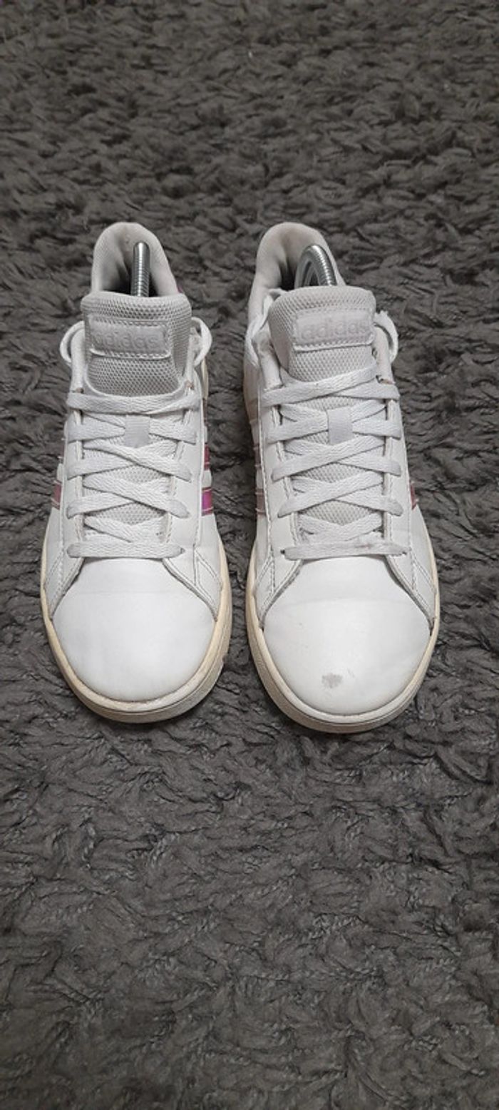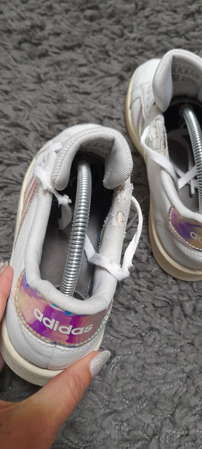 Paire de basket de la marque Adidas modèle Grand Court Lifestyle. Taille 36. Couleur blanche Iridescent (brillant avec reflets métallisés). En bon état général (usure sur l'intérieur voir photo) #BASKET36_vanesslavaness #basket36 #basketadidas36