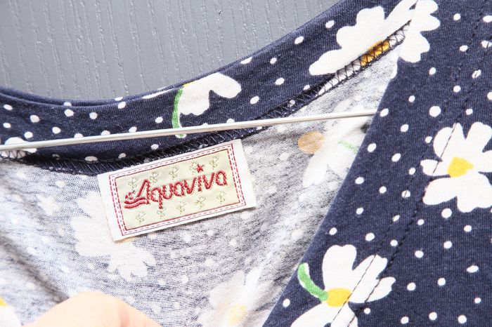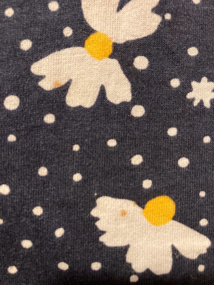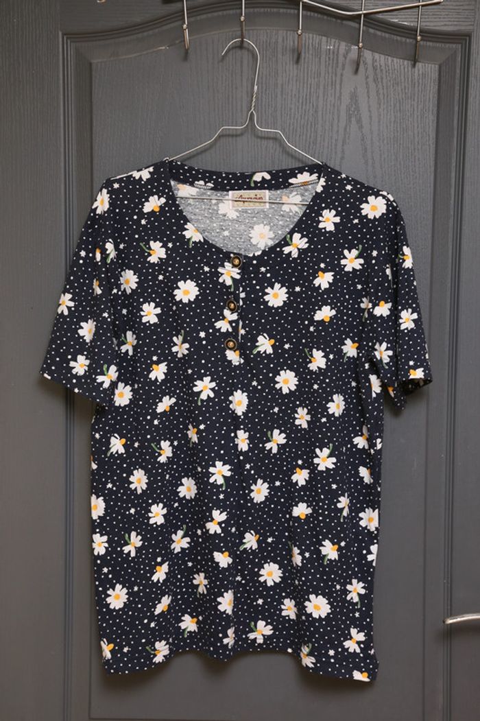 Taille L mais voici les mesures car je ne sais pas comment ça taille.. Aisselle à aisselle : 57cm Col au bas : 70cm Petites taches sur fleurs en bas du t-shirt, je ne sais pas si elles partiront sur un prochain lavage..