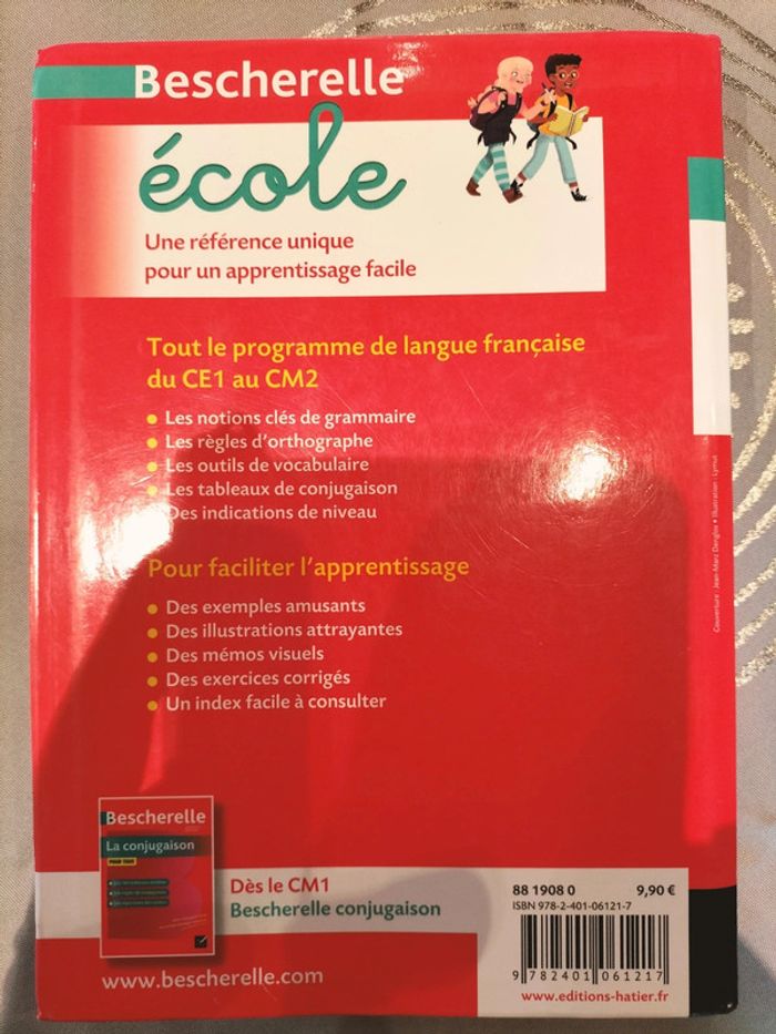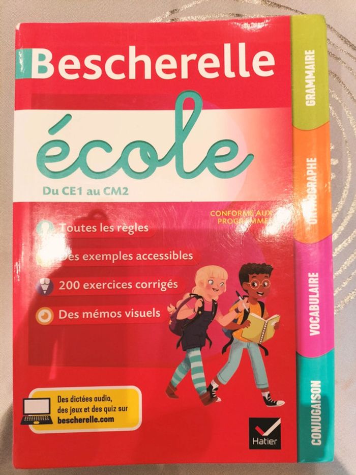 Tout le programme de grammaire, orthographe, vocabulaire, conjugaison, de langue française du CE1 au CM2, avec des exemples des illustrations, des mémos, des exercices et un index facile à consulter en très bon état très peu utilisé, à noter un angle légèrement abîmé.
