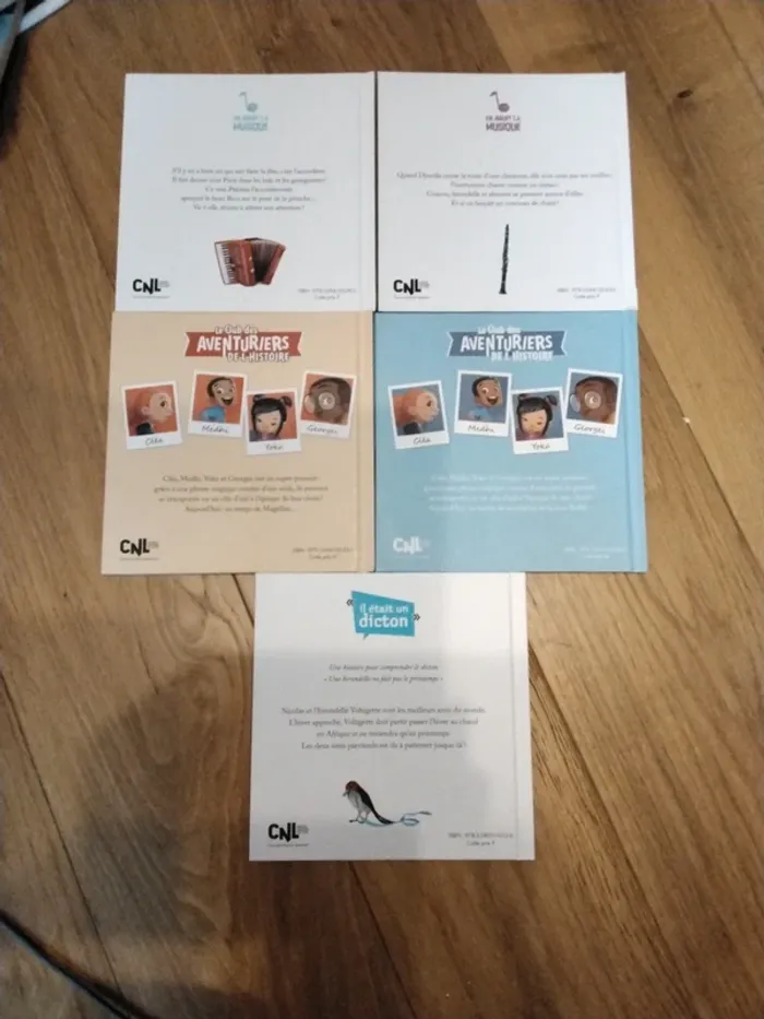 5 livres : La clarinette qui parlait aux oiseaux L'accordéon marchand de bonheur Une hirondelle ne fait pas le printemps L'expédition de Magellan, À la rencontre de Gustave Eiffel. En très bon état,couvertures rigides.