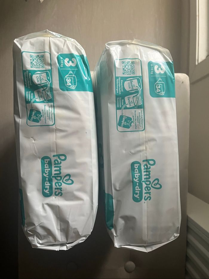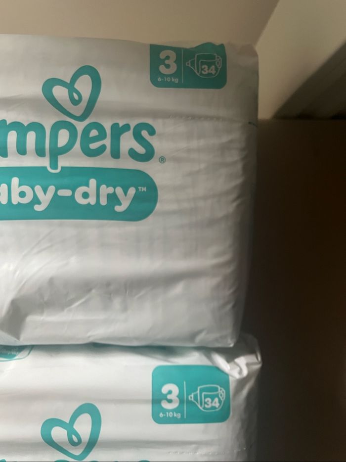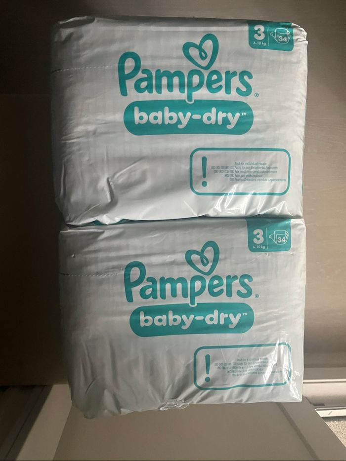 Deux paquets de couches Pampers neufs baby dry taille 3 (6/10kg) : 34 couches par paquet soit 68 au total.