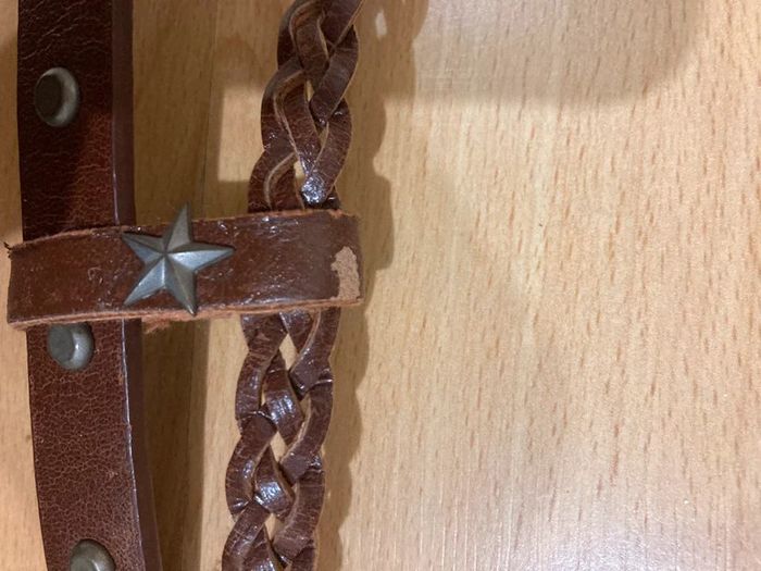 Simili cuir, bon état, quelques accrocs. Je peux la faire à 0,50€ sur l'achat d'un lot. 102cm.