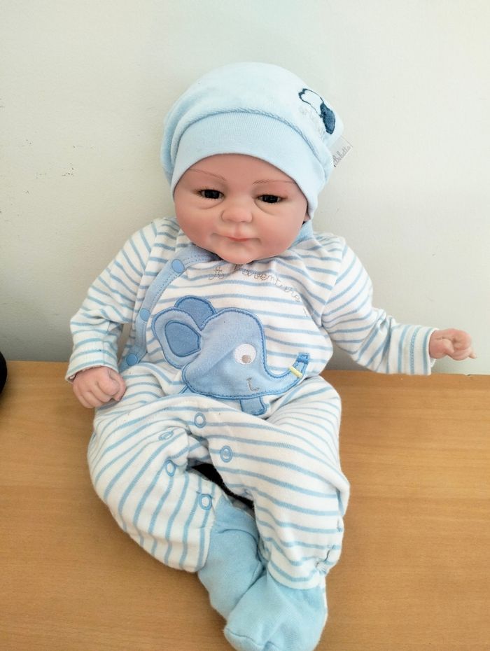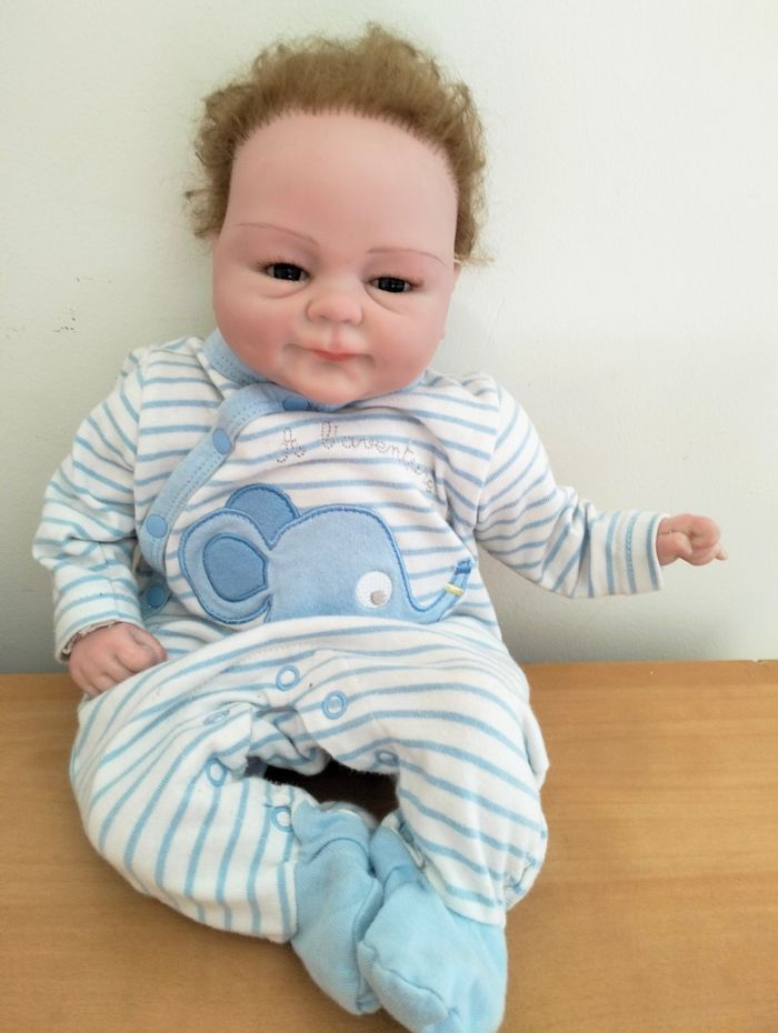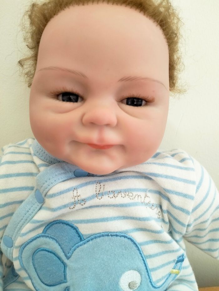 Bébé réaliste, son poids avec vêtements est de 690 kg et mesure 40 cm de la tête aux pieds. Je ne connais pas la marque, les vêtements qu'il utilise sont pour les bébés prématurés, je les ai un peu ajustés.