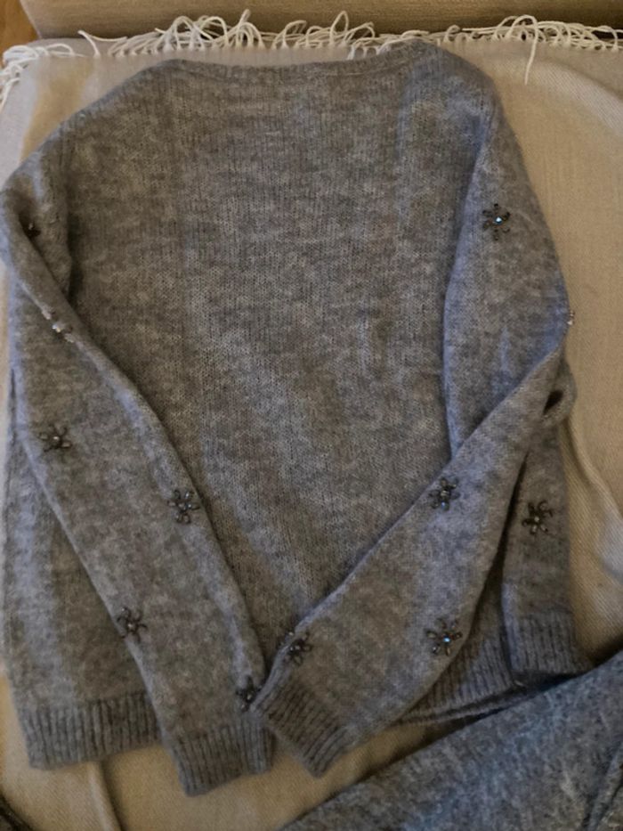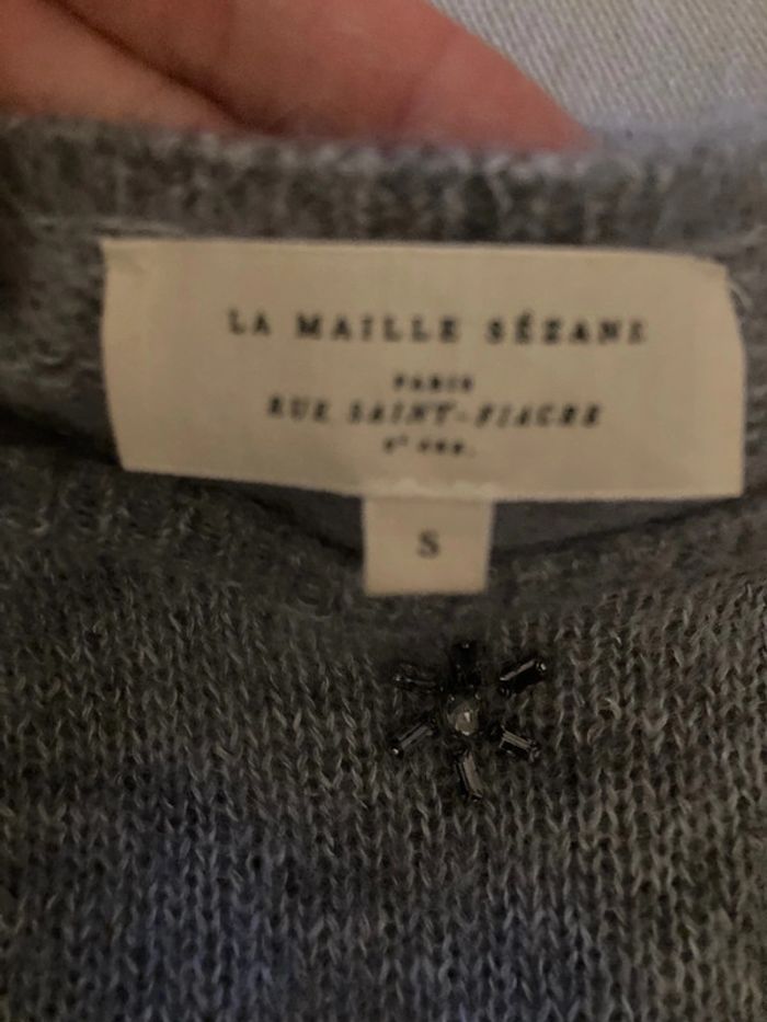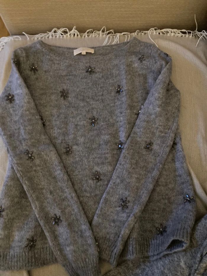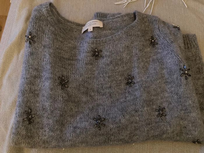 Pull Sézane gris clair avec strass ton sur ton en forme de fleurs sur le devant et les manches, taille S mais taille petit donc peut convenir à un XS, #sezane #sezanelovers #sezaneaddict