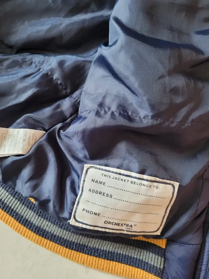 Taille 12 ans Lot composé de : - 1 gilet zippé noir In Extenso 69% polyester 29% coton 2% élasthanne Très bon état - 1 veste Tissia bleu jean Assez bon état - 1 manteau à capuche Orchestra bleu marine jaune moutarde et gris 100% polyester Fermeture par fermeture éclair et pressions Très bon état